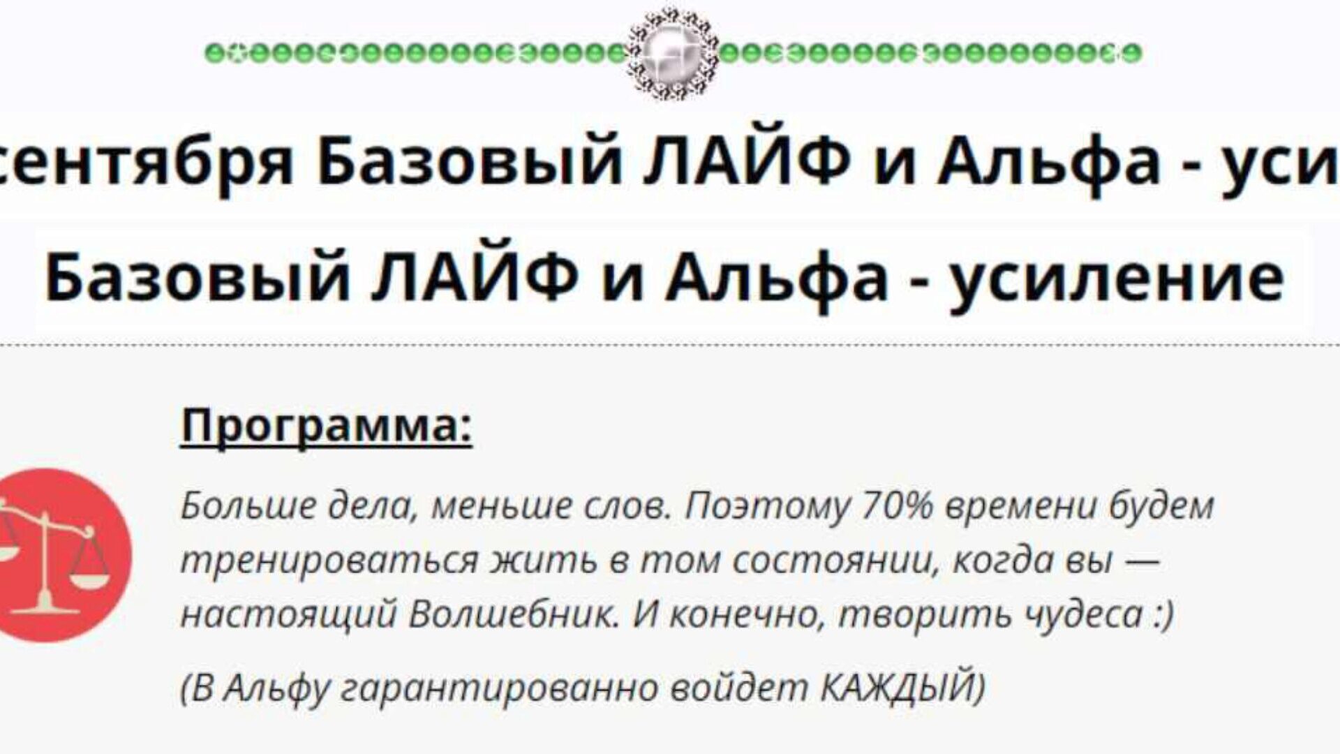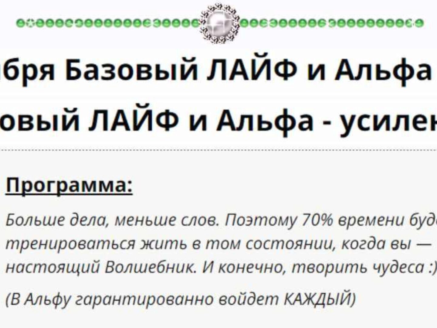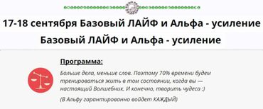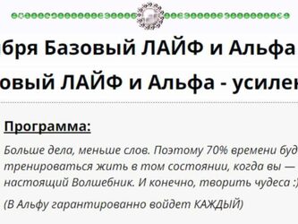 ПРОГРАММА: День первый Вступление. 1.Что такое альфа состояние (АС) 2.Научное подтверждение невероятной силы (АС). 3.Как с помощью (АС) Вы обретете успех в любой сфере жизни. 4. Уникальные достижения тех, кто пользуется альфа состоянием повседневно. Методика Альфа, как синтез прогрессивных методик: