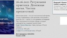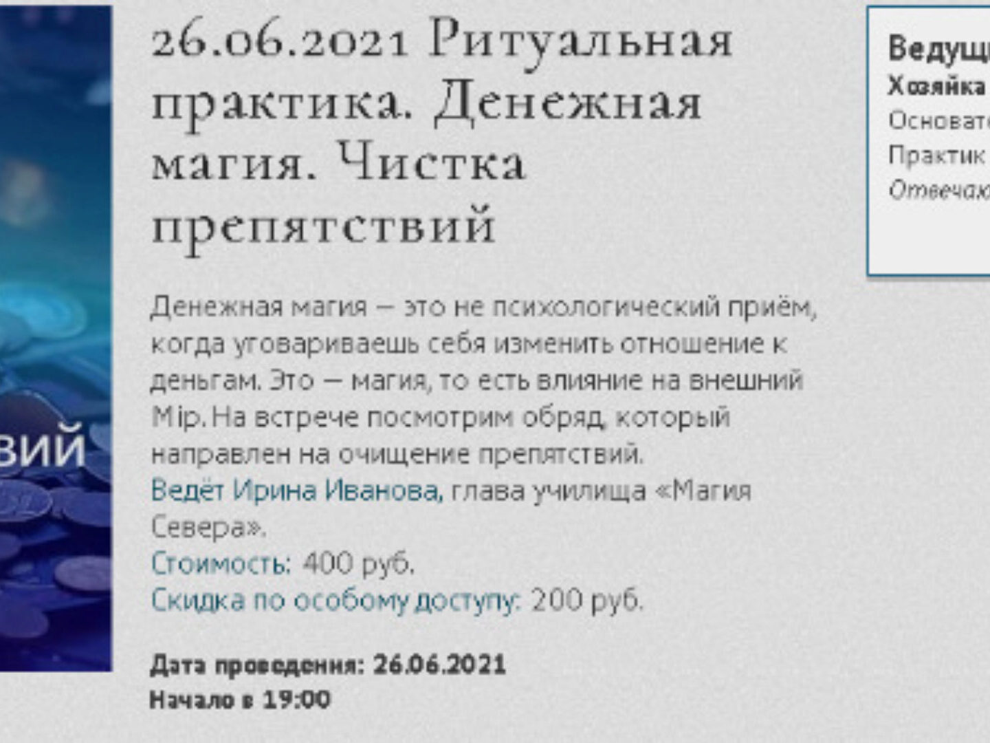 Денежная магия — это не психологический приём, когда уговариваешь себя изменить отношение к деньгам. Это — магия, то есть влияние на внешний Мiр. На встрече посмотрим обряд, проводимый на Полнолуние, который направлен на денежное благополучие Ведёт Ирина Иванова, глава училища «Магия Севера».