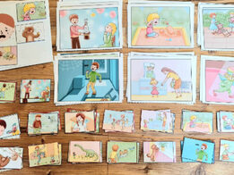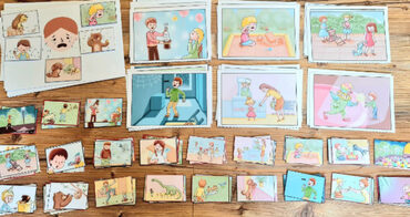 Пособие включает: - 20 карточек - действий - 20 карточек - нелепиц - 20 карточек - действий в прошедшем времени - 20 пиктограмм - 20 картинок предметов (отвечающие на вопрос «ЧЕМ» ) - 20 картинок предметов (отвеч. на вопрос «ЧТО») - 4 плашки для ассоциативного ряда - 12 картинок (отвечает на «КТО»)
