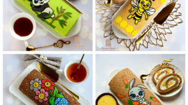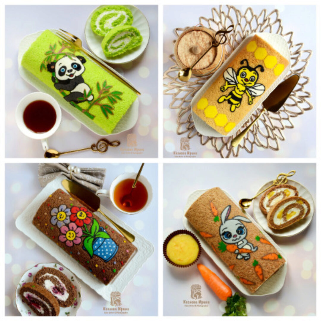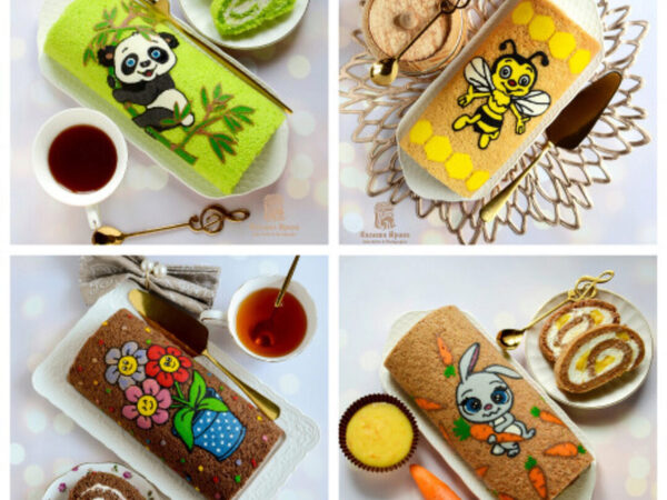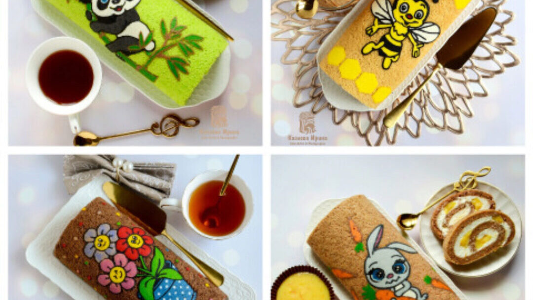 В рулетах не японский пресный бисквит, а целых пять вкусных рецептов, адаптированных под рисунок тестом.