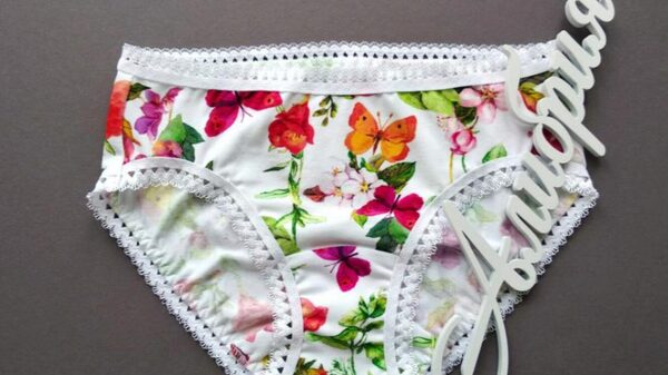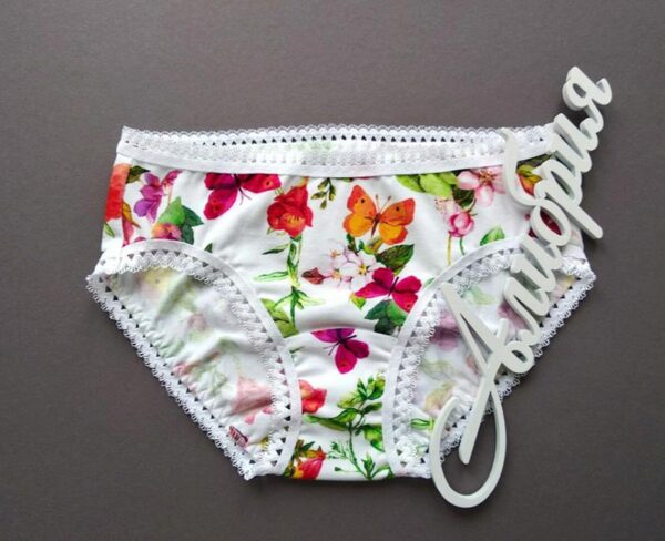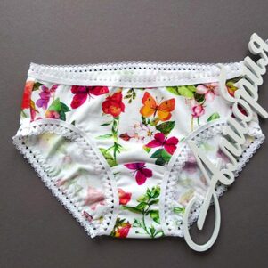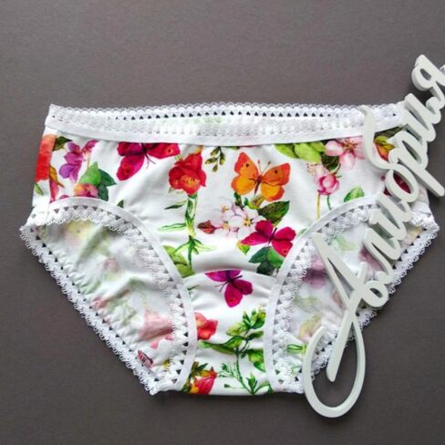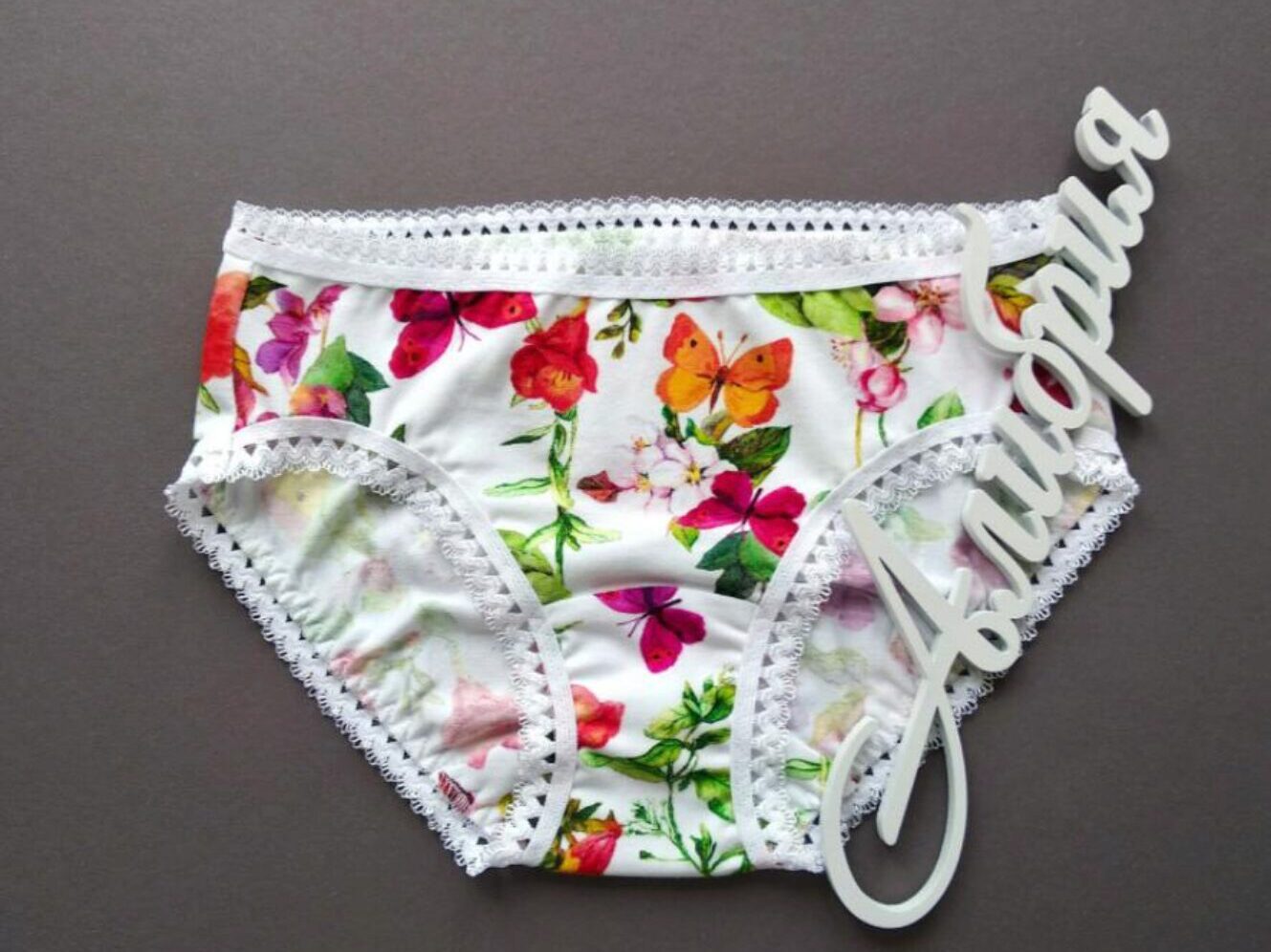 Трусики-бикини. Передняя и задняя часть цельная, по бокам резинки. Фестоны идут на боковых частях. Боковые швы отсутствуют. Подкладка ластовицы - кулирка. Рекомендуемый материал - неэластичное кружево.