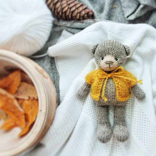 В формате PDF. 23 стр, 65 фотографии процесса. Все детали вяжутся на трёх спицах, четвёртая рабочая. Уши крючком. Голова и лапки пришиваются. Готовая игрушка получается 14 см. Есть короткие ряды в технике « Оберни и поверни » . Содержит описание свитера. Основная пряжа Alize Alpaca Royal. Спицы 1,8