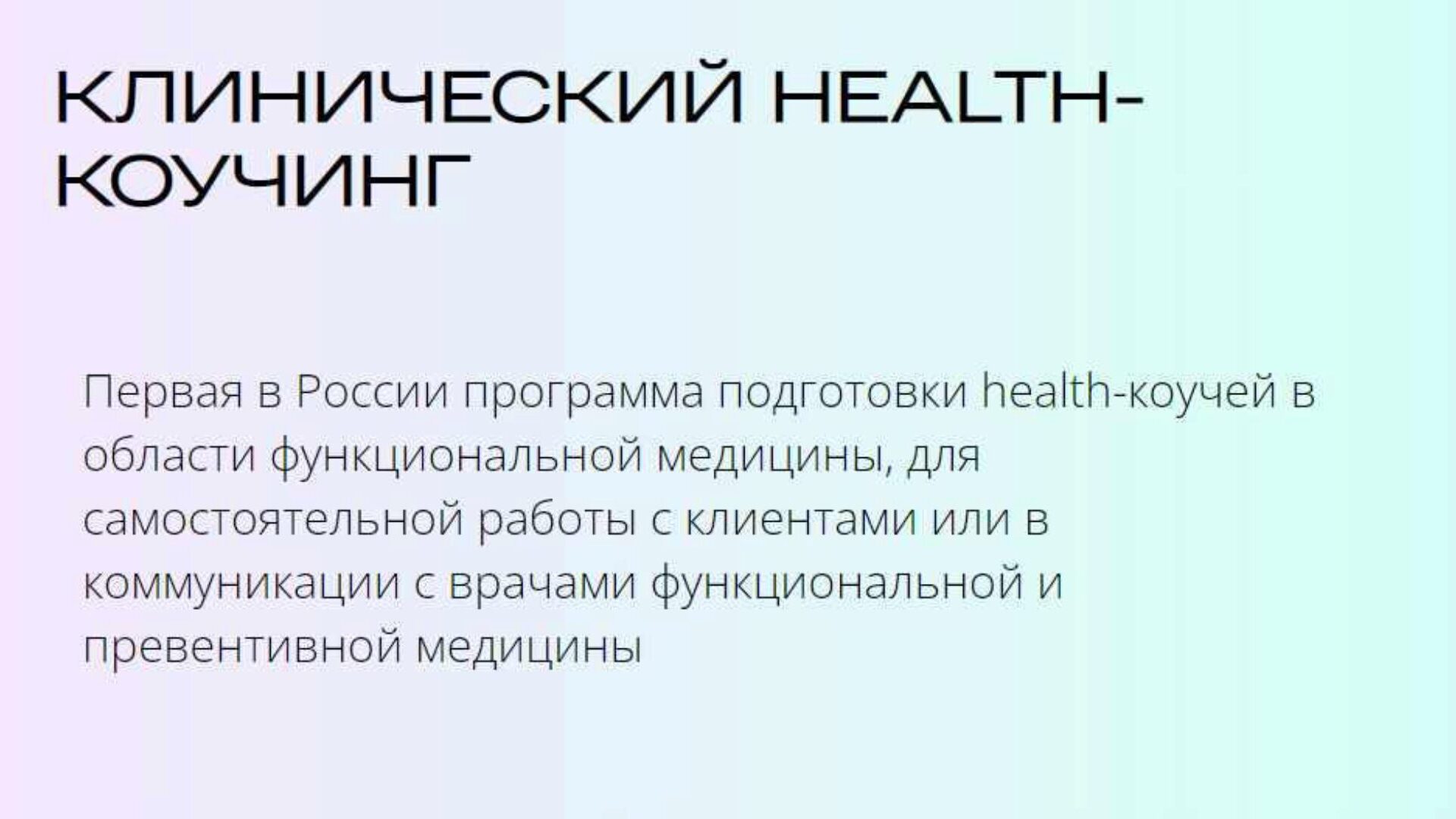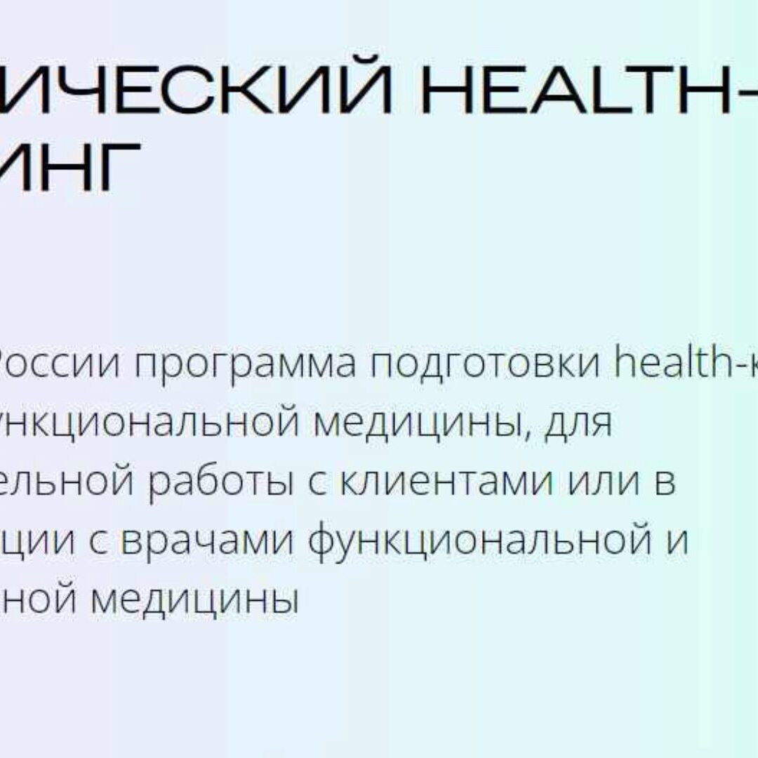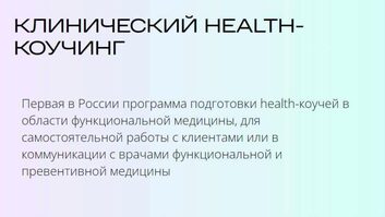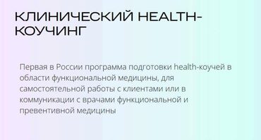 Первая в России программа подготовки health-коучей в области функциональной медицины, для самостоятельной работы с клиентами или в коммуникации с врачами функциональной и превентивной медицины Это комплексная экспертная программа подготовки health-коучей-консультантов в области функциональной