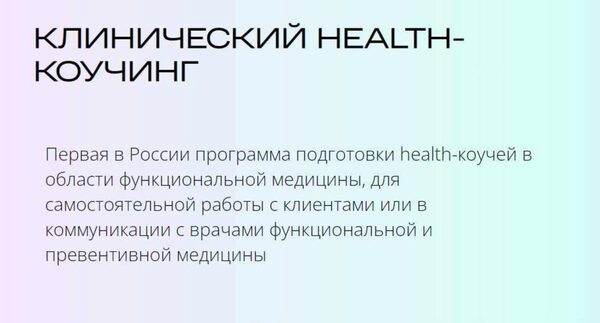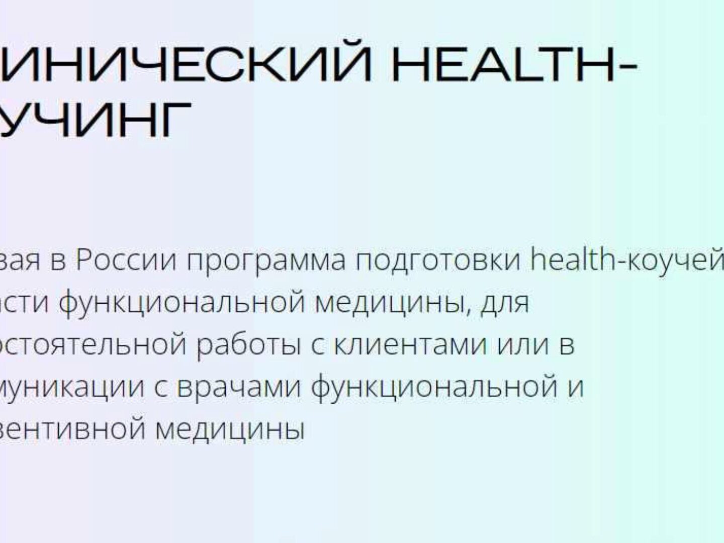 Это комплексная экспертная программа подготовки health-коучей-консультантов в области функциональной медицины Программа даст вам необходимые знания и инструменты для работы с людьми с различными заболеваниями: как физическими, так и психическими. Работа с такими клиентами требует углубленной и