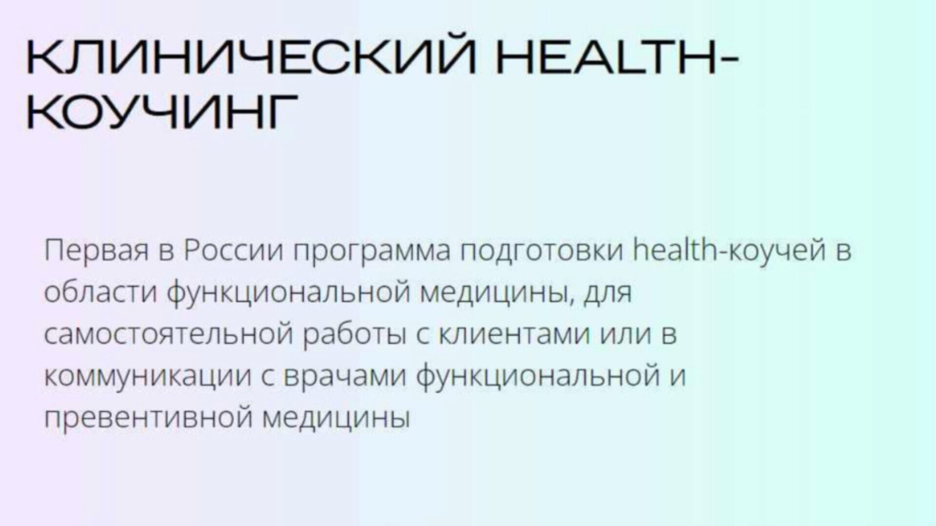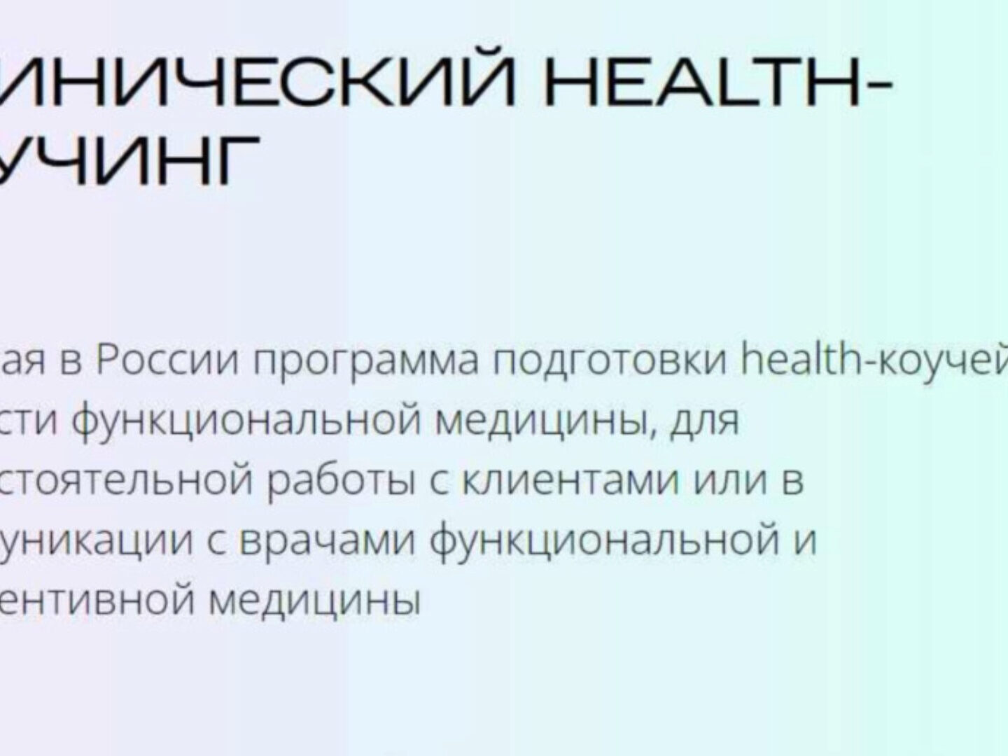 Первая в России программа подготовки health-коучей в области функциональной медицины, для самостоятельной работы с клиентами или в коммуникации с врачами функциональной и превентивной медицины Это комплексная экспертная программа подготовки health-коучей-консультантов в области функциональной