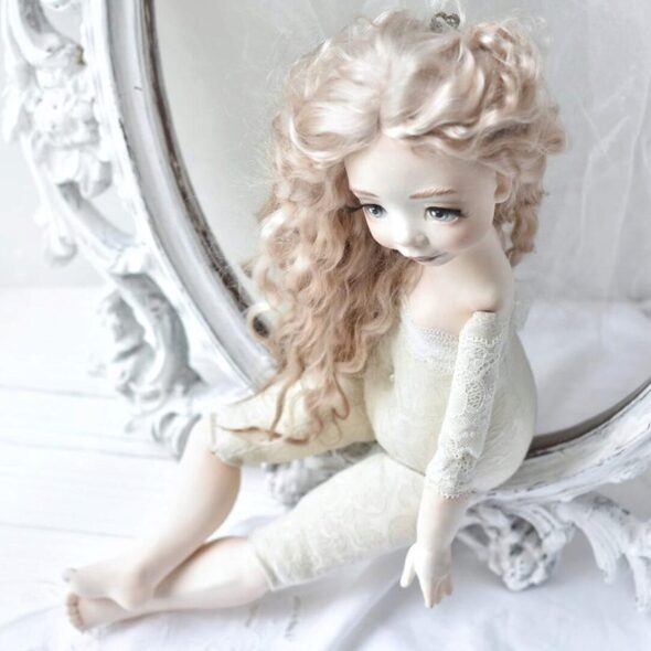 Лепка деталей куклы из самозатвердевающего пластика с поворотной головой и армированными пальчиками рук. Обработка деталей, роспись. Создание несъемного паричка из козьей шерсти. Пошив аккуратного тела со шплинтовым креплением конечностей и опилковым наполнителем. Сборка шарнирного крепления