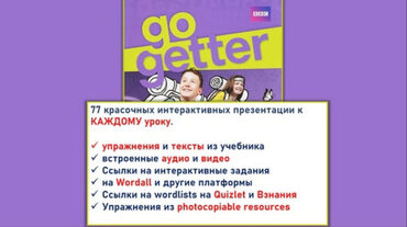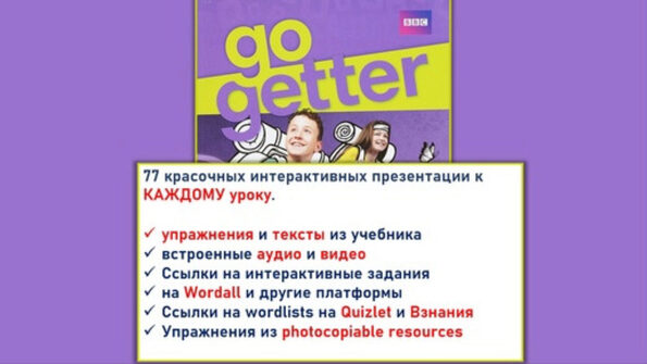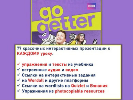Поурочные разработки для работы по учебнику GO GETTER 1(70 презентаций). Презентации содержат: упражнения из учебника с элементами анимации и возможностью проверки, встроенные аудио и видео, ссылки на дополнительные интерактивные упражнения на WORDWALL, LEARNINGAPPS и другие платформы, ссылки на