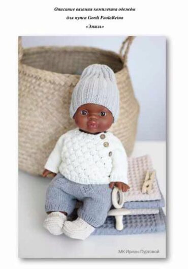 Описание вязания комплекта одежды для пупса Горди 34см. По данному МК можно связать шляпку с ушками, песочник - боди, носочки спиральки. Для вязания понадобятся спицы чулочные и круговые номер 2. Крючок номер 3 для шляпки. Нитки Yarn Art Jeans 50г/160м. МК отправляю в виде файла pdf.