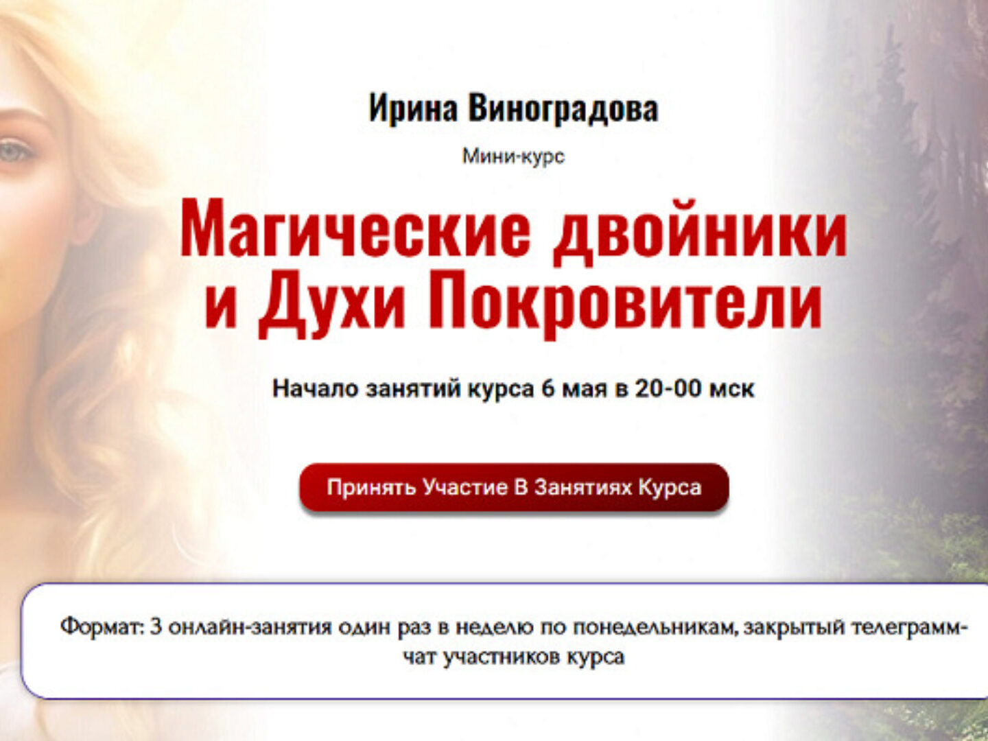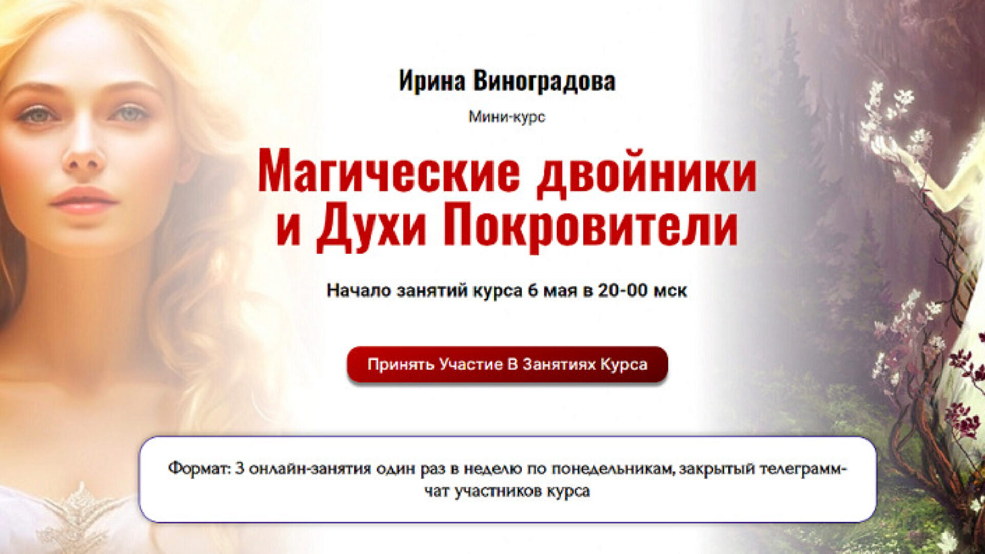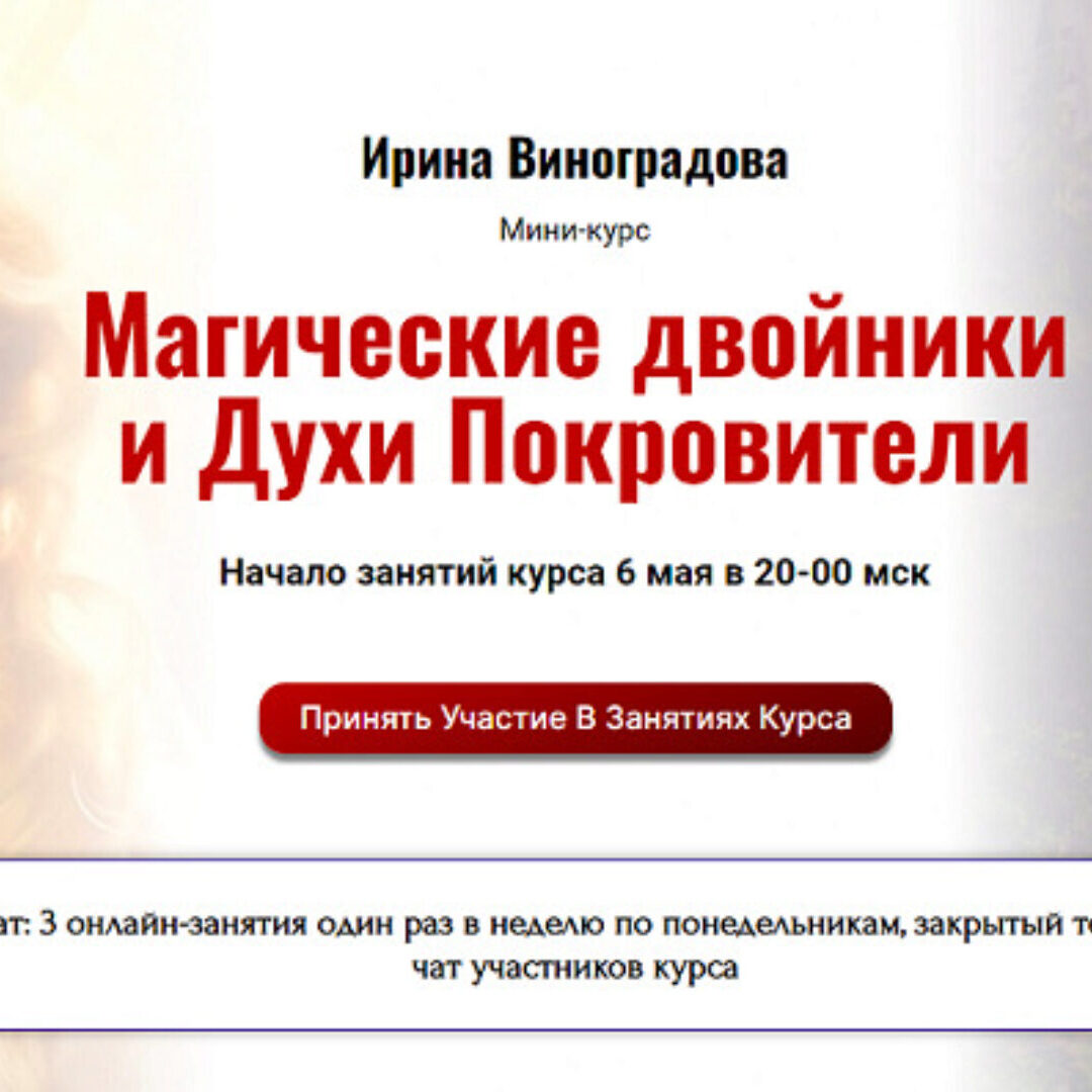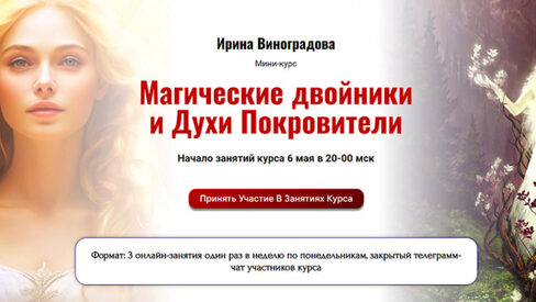 Ирина Виноградова приглашает вас на курс, на котором вы создадите своего Магического Двойника, познакомитесь с Магией Вольта и заручитесь поддержкой Духов-покровителей
