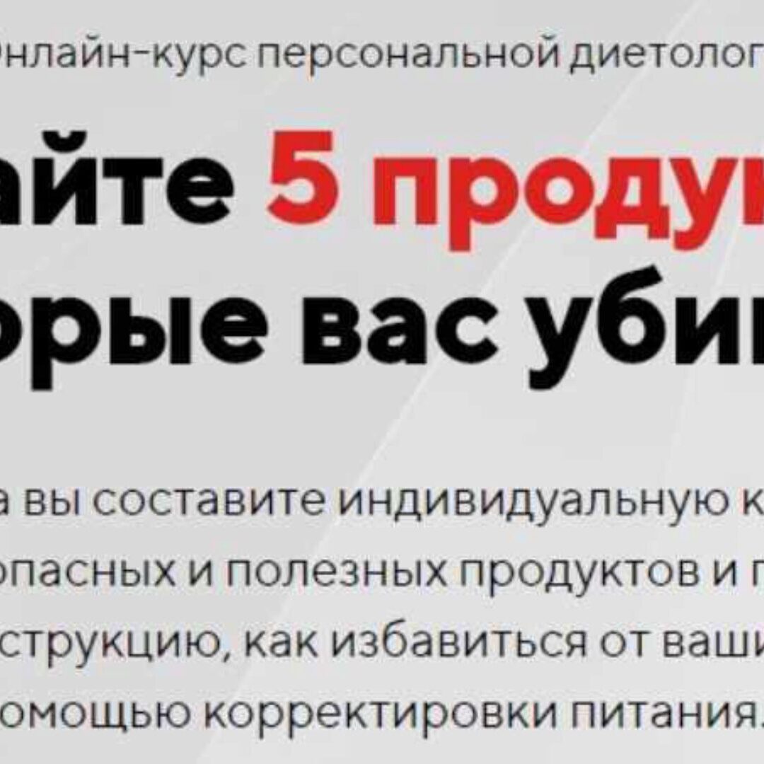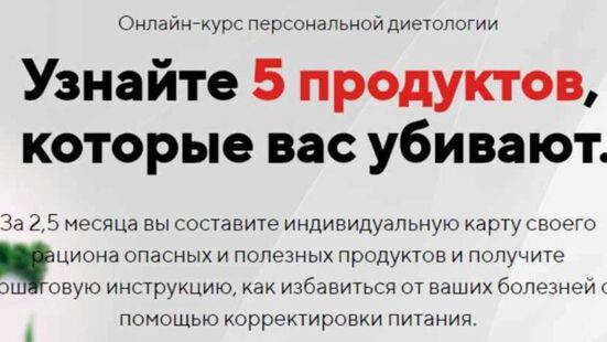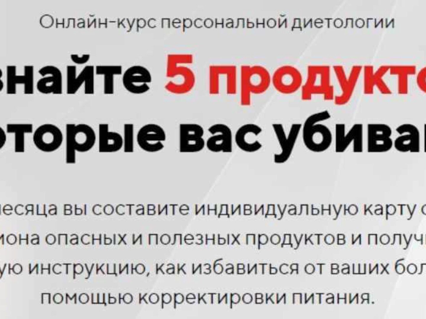 За 2,5 месяца вы составите индивидуальную карту своего рациона опасных и полезных продуктов и получите пошаговую инструкцию, как избавиться от ваших болезней с помощью корректировки питания.