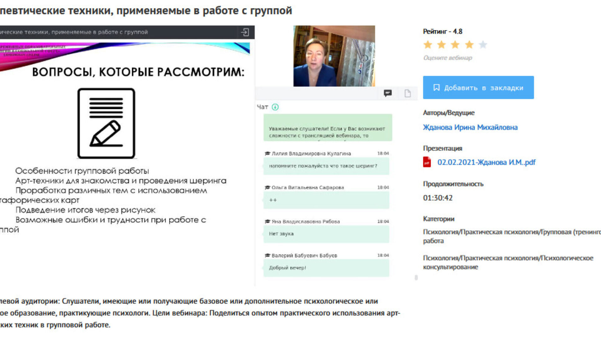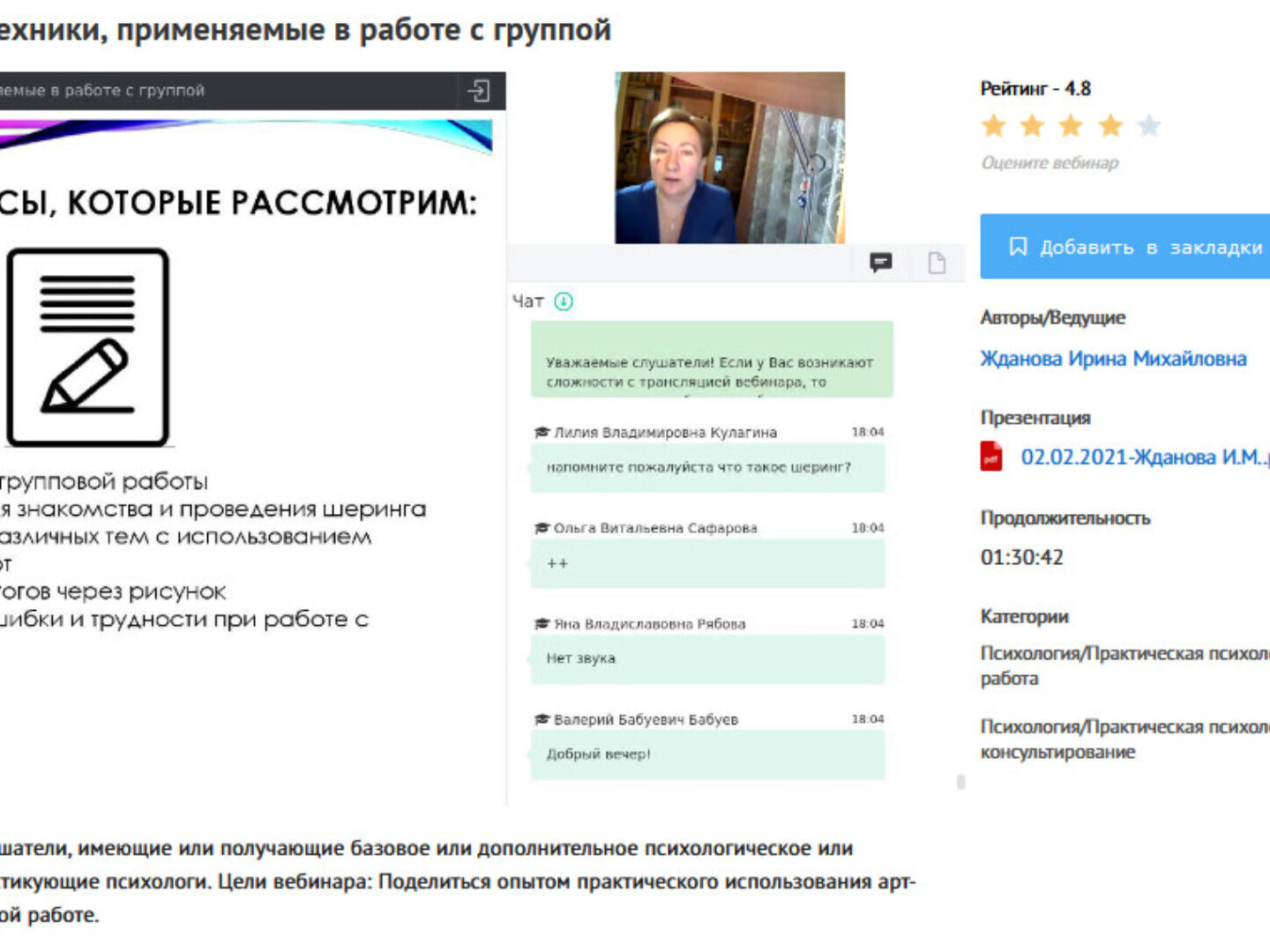 Описание целевой аудитории: Слушатели, имеющие или получающие базовое или дополнительное психологическое или педагогическое образование, практикующие психологи. Цели вебинара: Систематизация знаний и приобретение практических навыков в работе с техникой «Пустой стул» 1. Видеозапись: «Техника