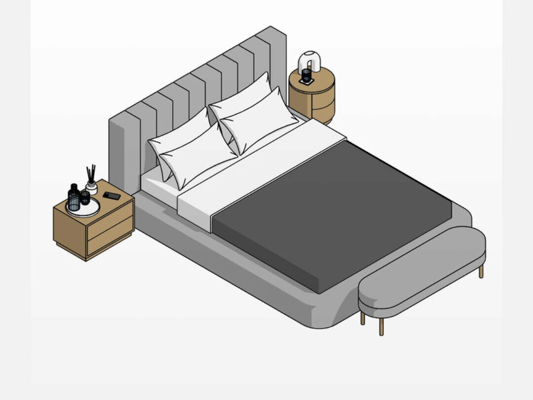 В состав набора входят: Универсальная кровать, Банкетка, Мягкая стеновая панель, Прямоугольная прикроватная тумбочка, Круглая прикроватная тумбочка