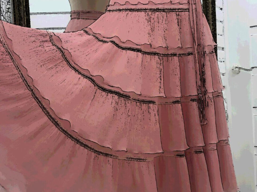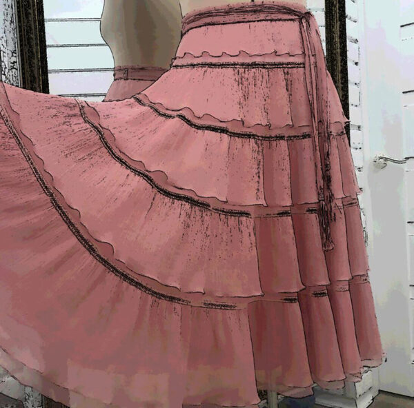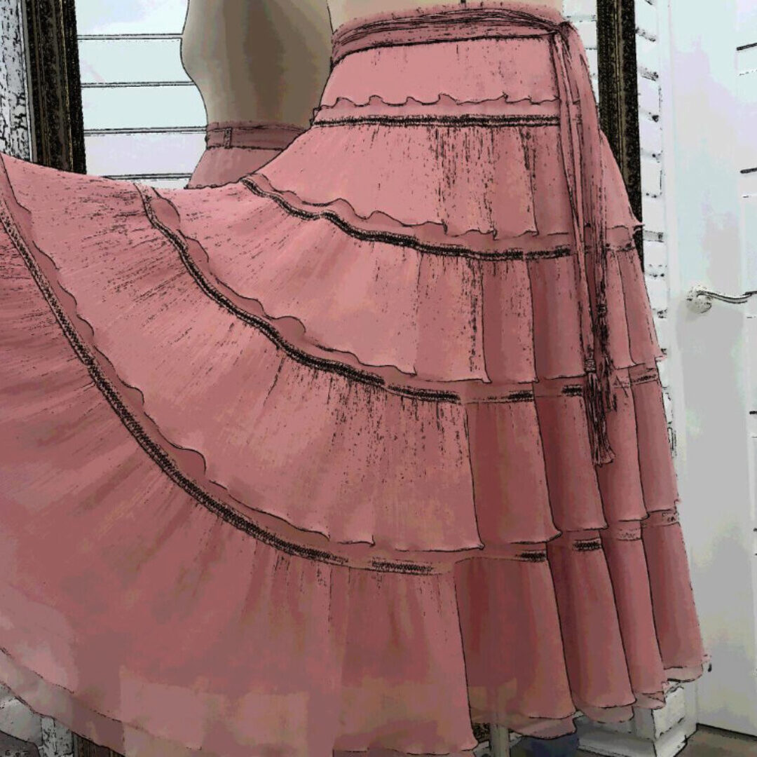 Первой на страничке уже есть эта слоеная юбка из жатого шифона. На ее примере покажу как обрабатывать края прозрачного шифона, как соединять детали, ну и конечно как делать оборки. Собственно, рюши в этом юбочном примере это гвоздь программы. Их будет много, поэтому надо четко и слажено действовать.