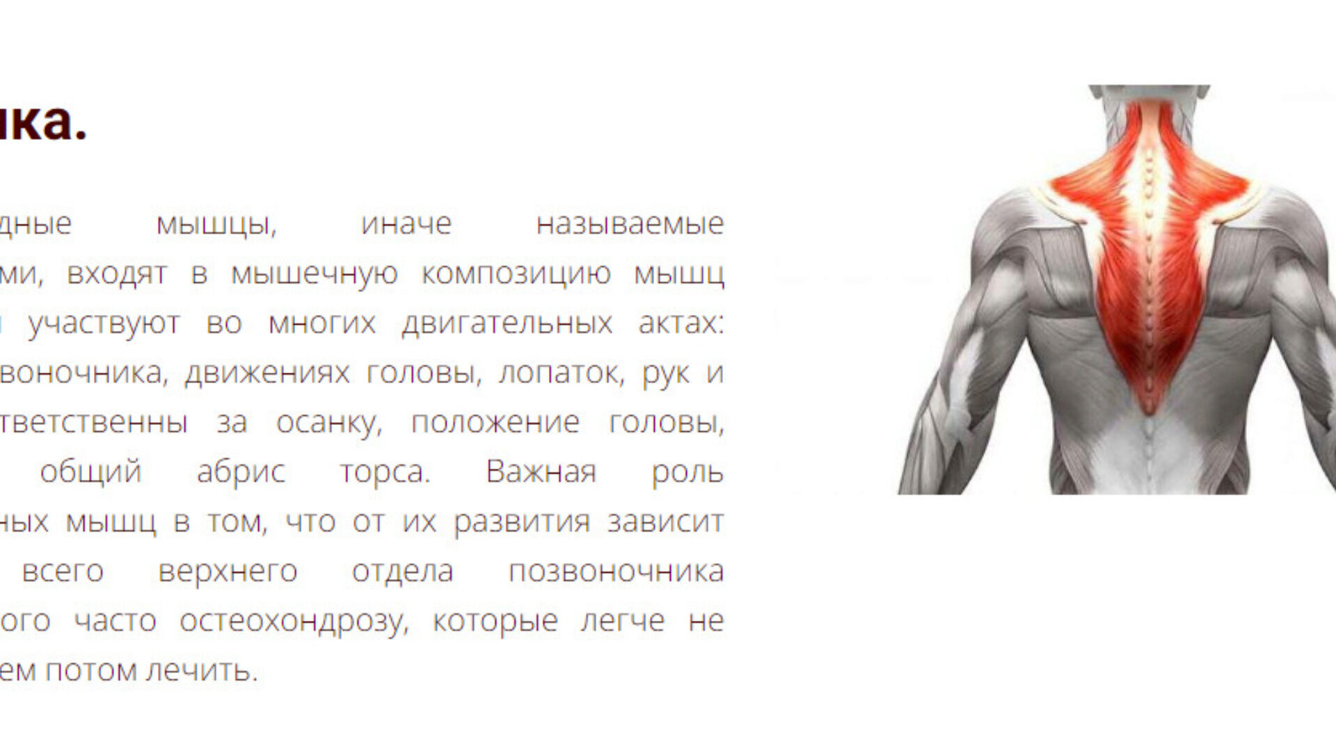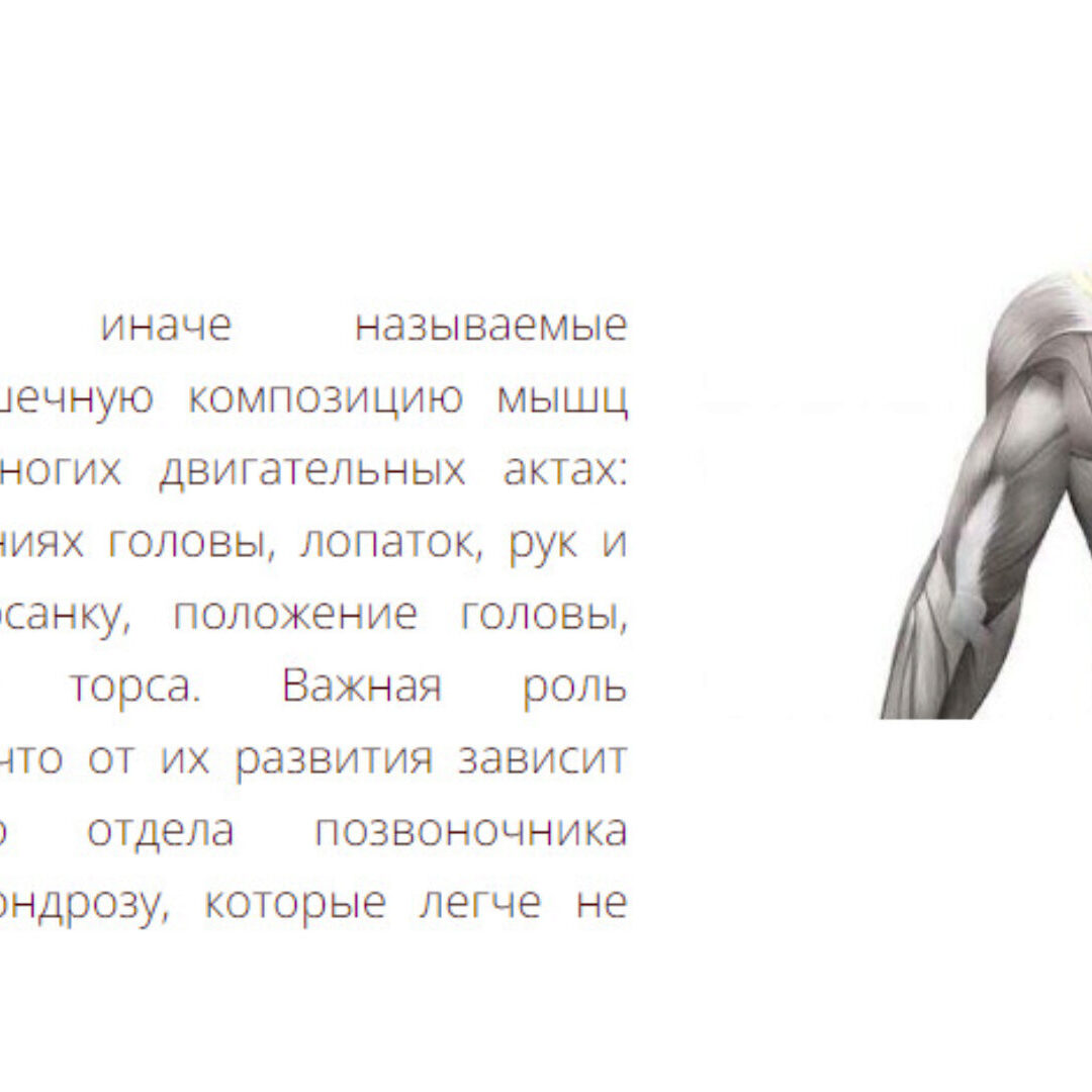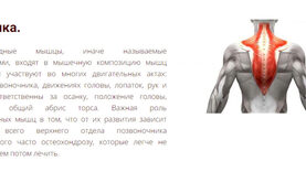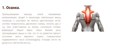 Трапециевидные мышцы, иначе называемые капюшонными, входят в мышечную композицию мышц туловища и участвуют во многих двигательных актах: изгибах позвоночника, движениях головы, лопаток, рук и т.д. Они ответственны за осанку, положение головы, формируют общий абрис торса. Важная роль трапецевидных мышц в том, что от их развития зависит состояние всего верхнего отдела позвоночника подверженного часто остеохондрозу, которые легче не допустить, чем потом лечить.
