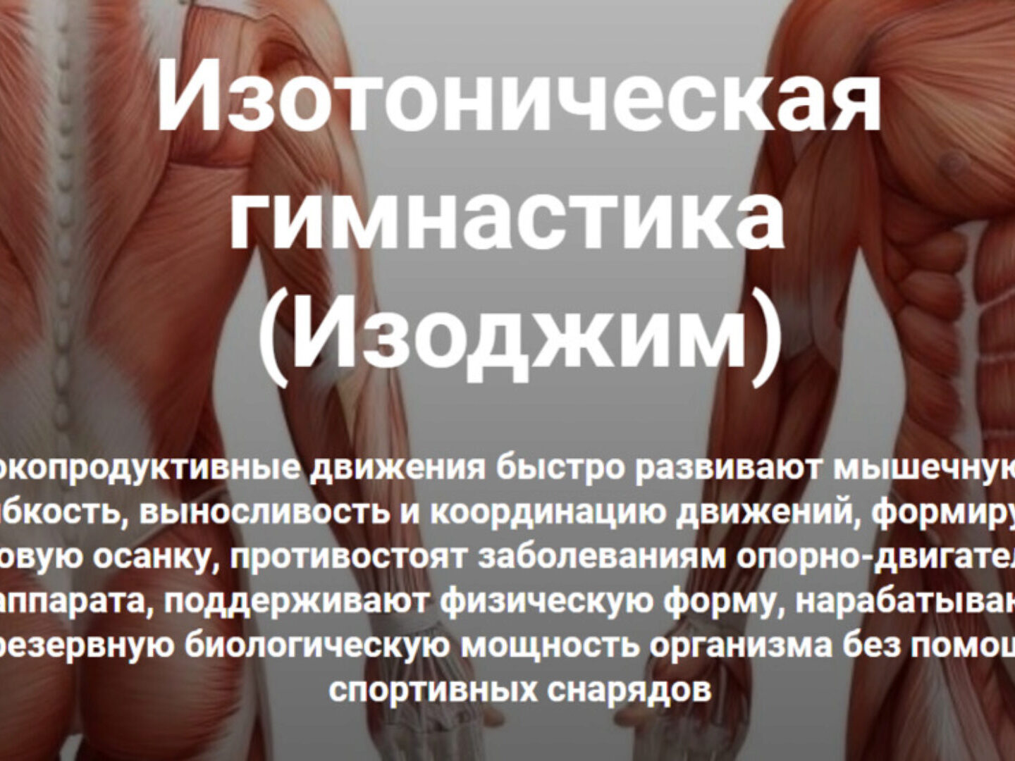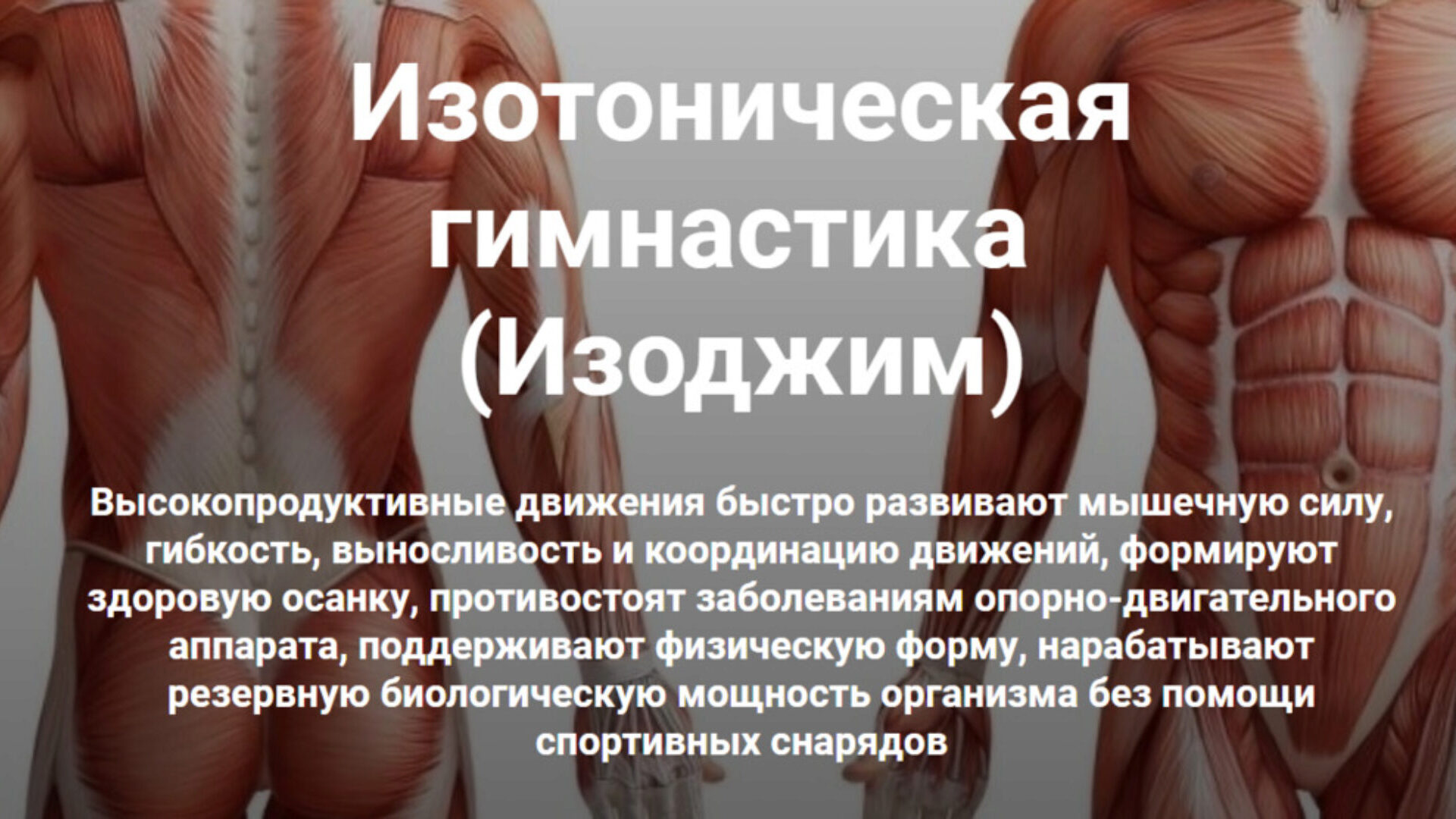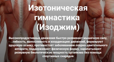 Изотоническая гимнастика Изотон — это научно обоснованная оздоровительная система. Цель системы — улучшение самочувствия, работоспособности, «физического здоровья», внешнего вида (форм тела, состава тела), повышение активности мужчин и женщин широкого возрастного диапазона. Эта система