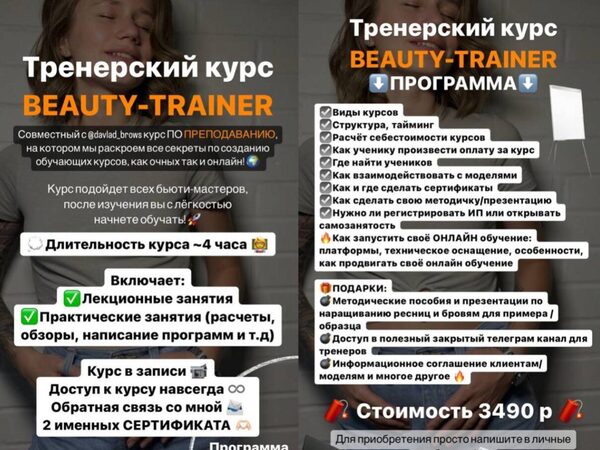 О курсе Lash-тренер Этот курс – не просто набор полезных знаний и инструкция, это полноценный тренинг, который поможет тебе кардинально поменять свою жизнь и стать успешной в лэш-сфере и не только. «Не откладывай свою жизнь на потом, а день за днем иди к своей мечте!» За время курса ты от начала до