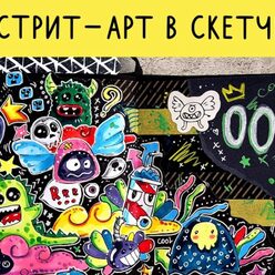 - создадим яркие иллюстрации и надписи в стиле граффити в скетчбуке;