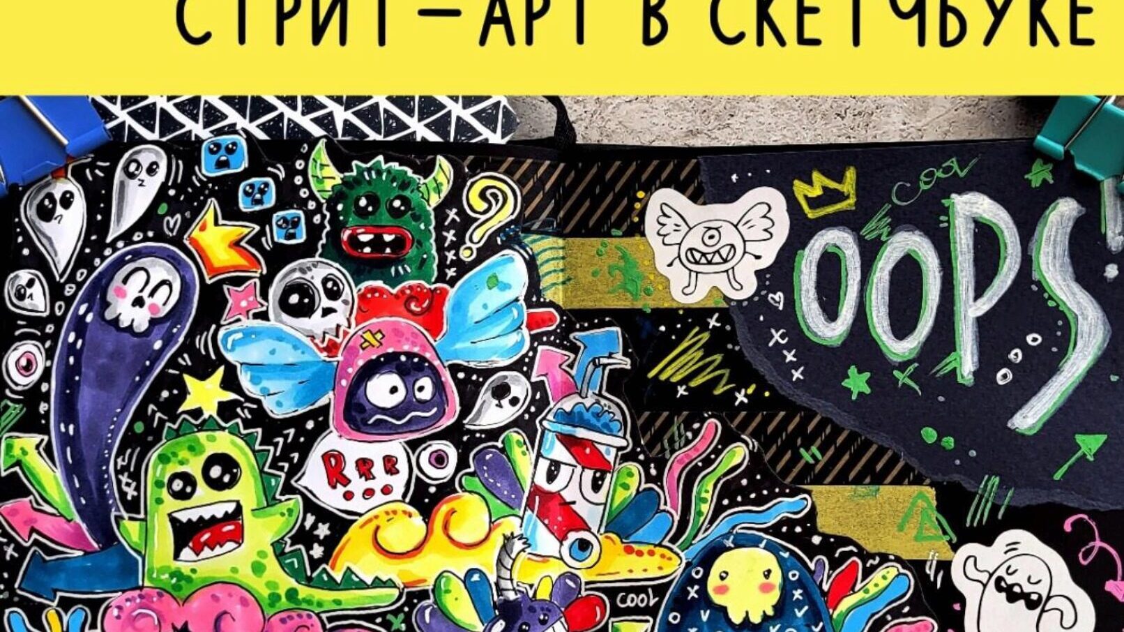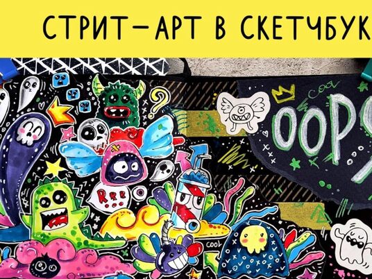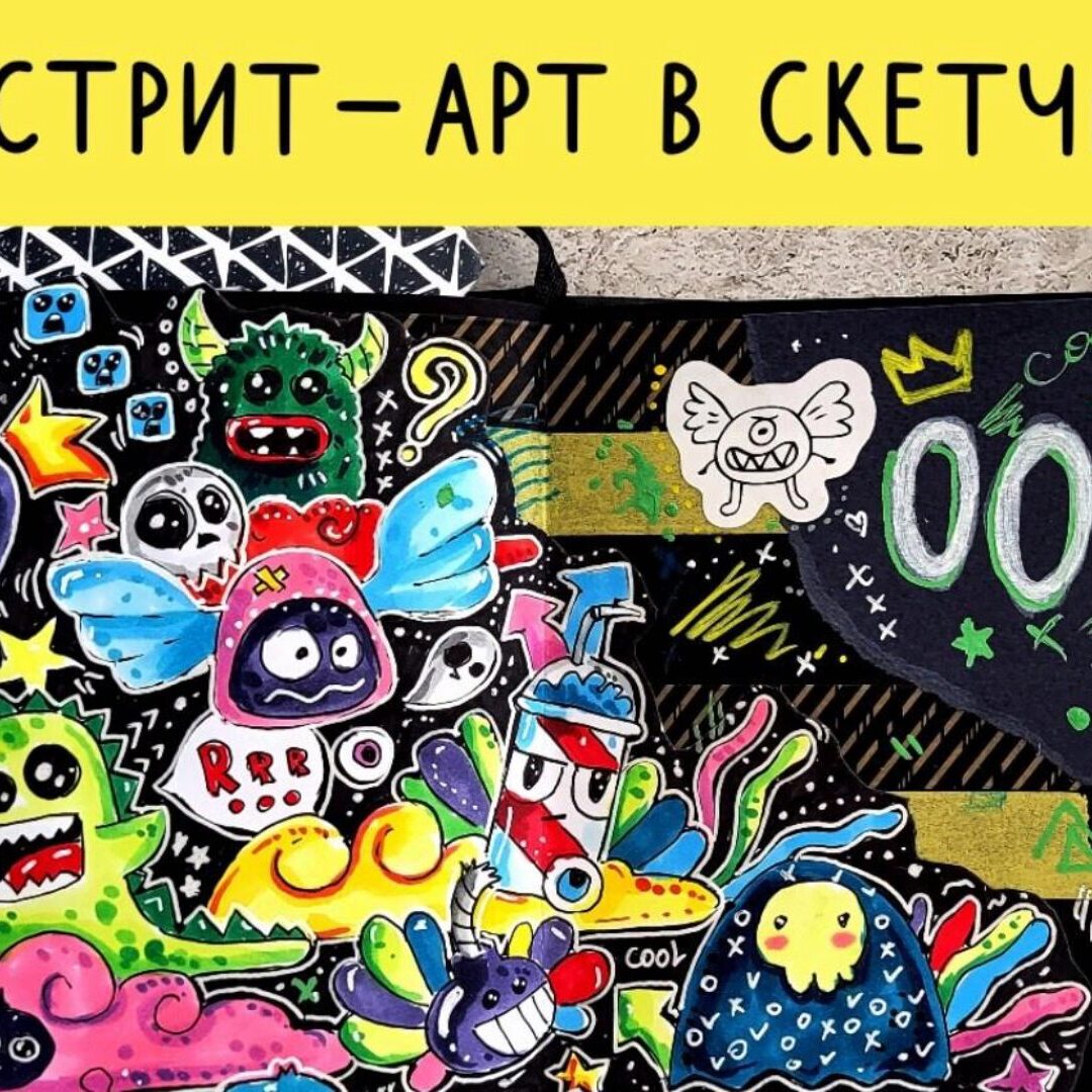 Представьте только, в своём скетчбуке вы создадите 6 иллюстраций в стиле стрит-арт: надписи, дудлы и стилизованных персонажей.
