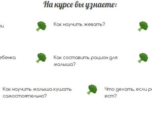 Спикер: Марина Кучина Содержание курса: - цели и задачи педприкорма - разбор популярных видов прикорма - признаки готовности к прикорму - организация педприкорма - принципы введения прикорма - какие продукты можно и нельзя давать - страхи мамы при введении прикорма - организация приемов пищи -