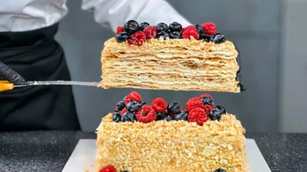 Он состоит: из классического слоеного теста нежнейшего заварного крема муслин и сгущенного молока