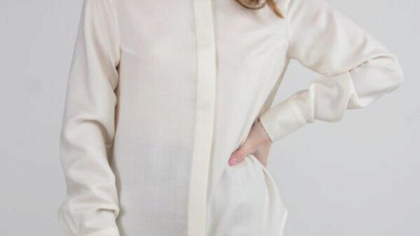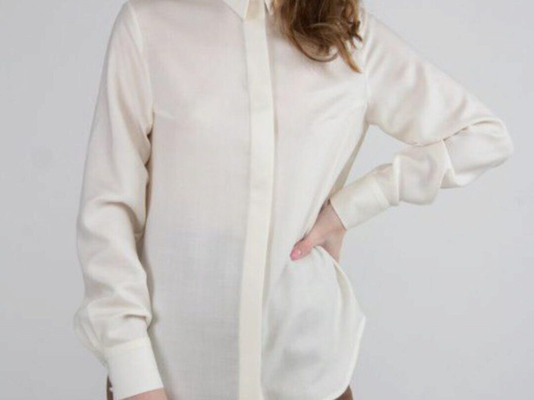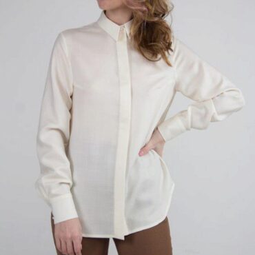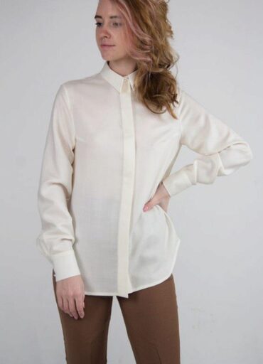 На фото блузка из сорочечной ткани — шерсть и шелк.