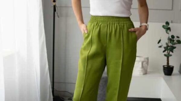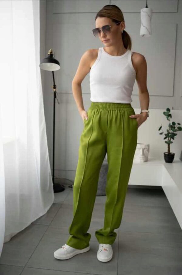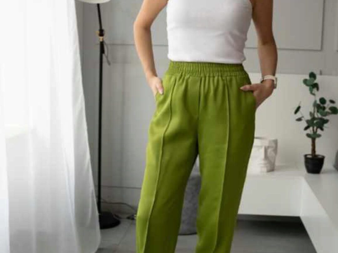 Выкройка брюк умеренного объема, прямого силуэта. На передних половинках карман с отрезным бочком и отделочной строчкой, заутюженные стрелки. На задних половинках талиевые вытачки, прорезные карманы с листочкой. Для данной модели подойдут мягкие костюмные и плательные ткани, без растяжения или с