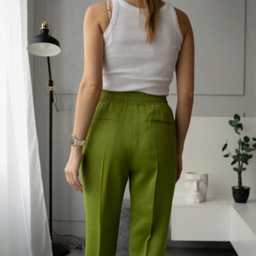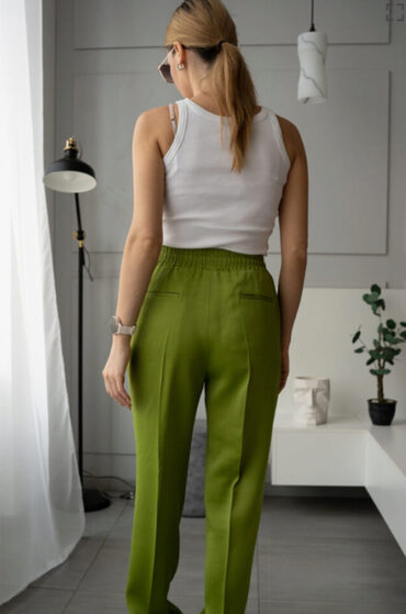 Выкройка брюк умеренного объема, прямого силуэта. На передних половинках карман с отрезным бочком и отделочной строчкой, заутюженные стрелки. На задних половинках талиевые вытачки, прорезные карманы с листочкой. Для данной модели подойдут мягкие костюмные и плательные ткани, без растяжения или с