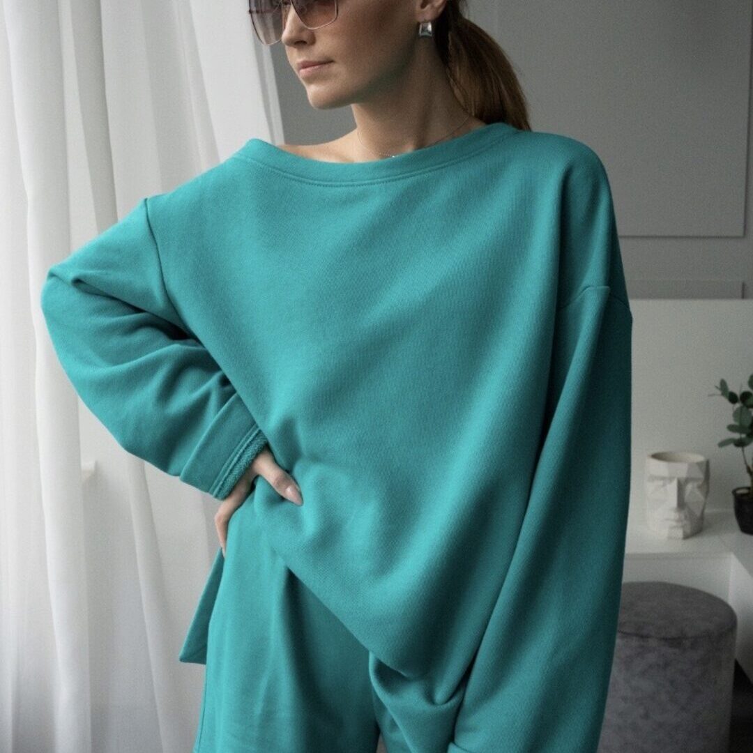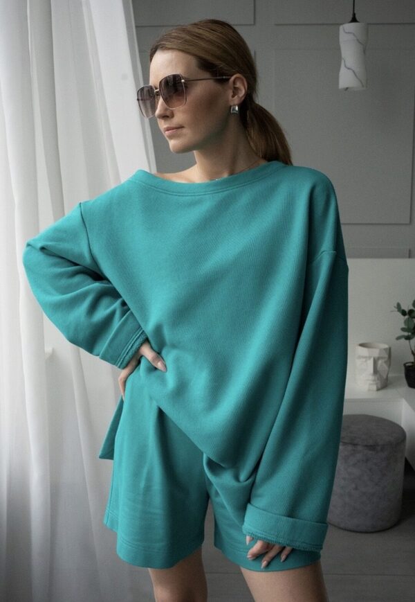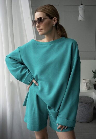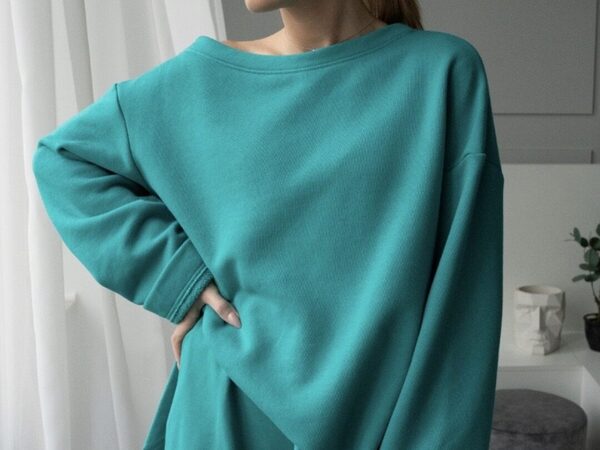 Выкройка свитшота большого объема, прямого силуэта, со спущенной линией плеча. Рукав рубашечного покроя, длинный, по низу рукава притачная манжета. Воротник — высокая стойка. Воротник оформлен на короткую неразъемную молнию по центру.. По низу изделия притачной пояс. Длина свитшота ниже линии