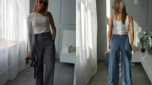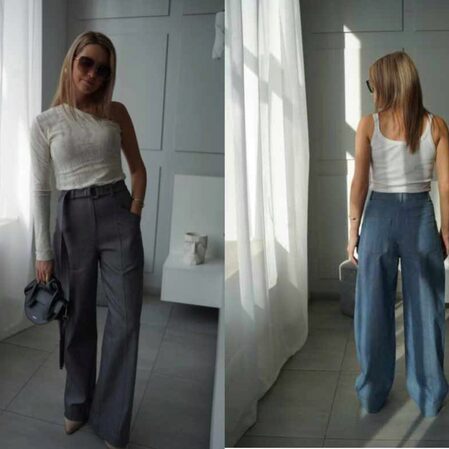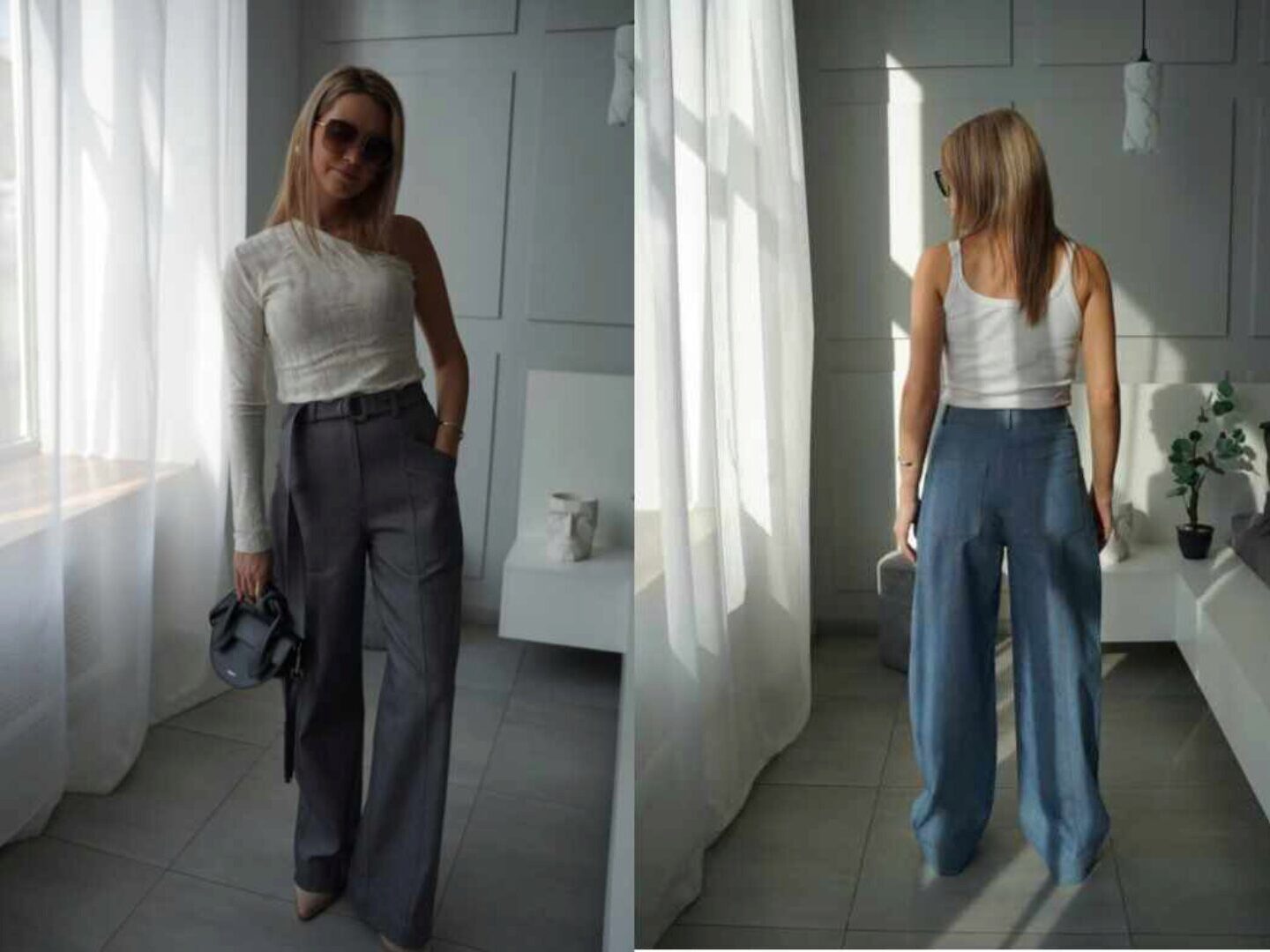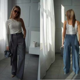 Выкройка брюк умеренного объема, прямого силуэта. Для данной модели подойдут средней плотности, мягкие, с эластаном или без него костюмные ткани.
