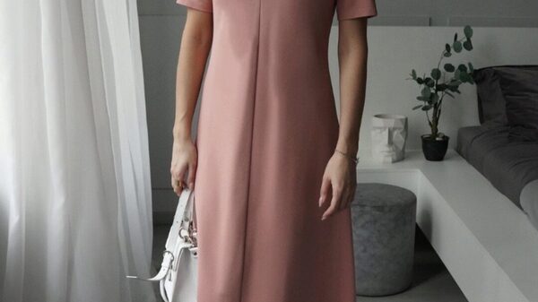 Выкройка платья малого объема, прилегающего силуэта в верхней части и расширенного книзу. Горловина платья оформлена цельнокроеным воротником-стойкой. Рукав втачной, длинный, двухшовный, с расширением книзу. По переду и спинке средний шов. На переде нагрудные вытачки, уходящие в боковой шов. По