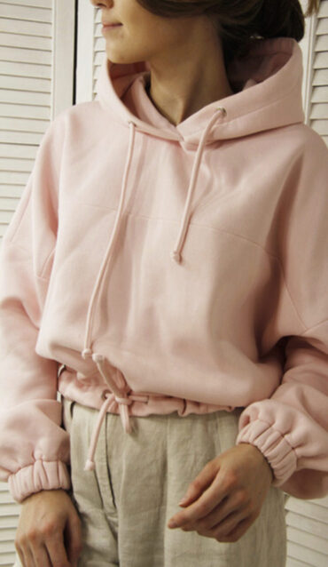 На фото белый свитшот выполнен из футера трехнитки петля умеренной плотности; розовый худи выполнен из футера трехнитки с начесом.