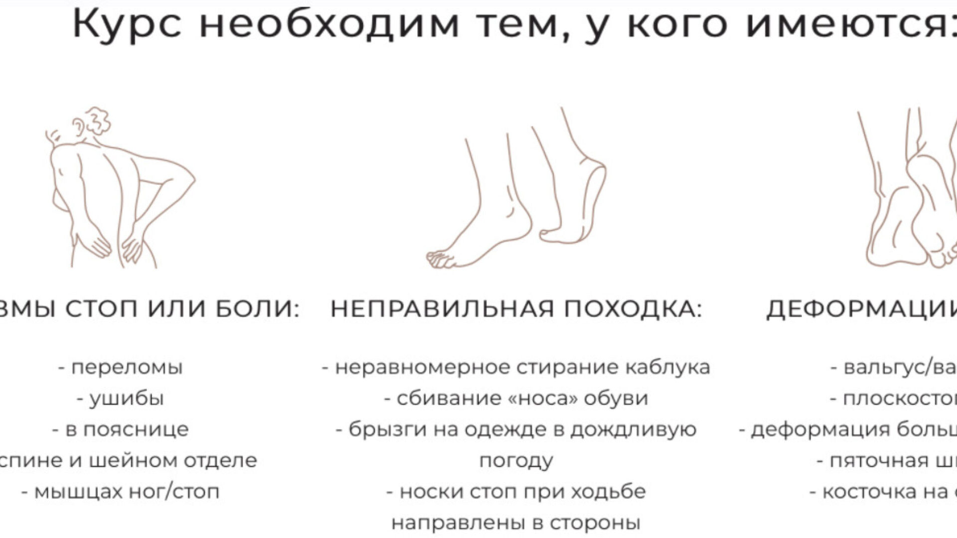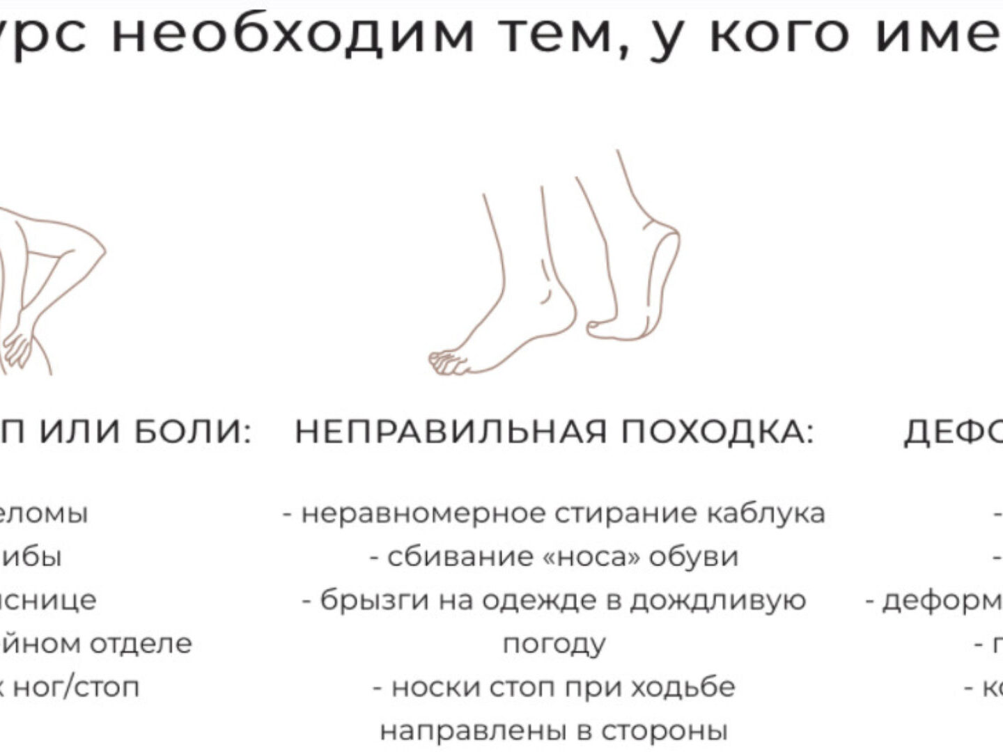 равно нарушениям во всех цепях, дряблая внутренняя поверхность бедра, косточка на стопе, висящий животик, сутулость.