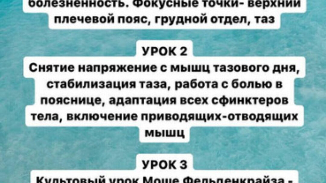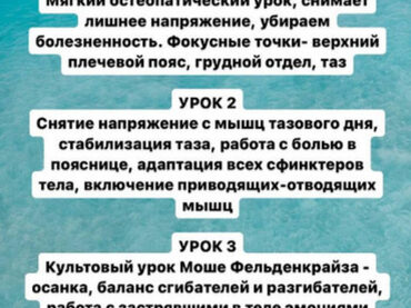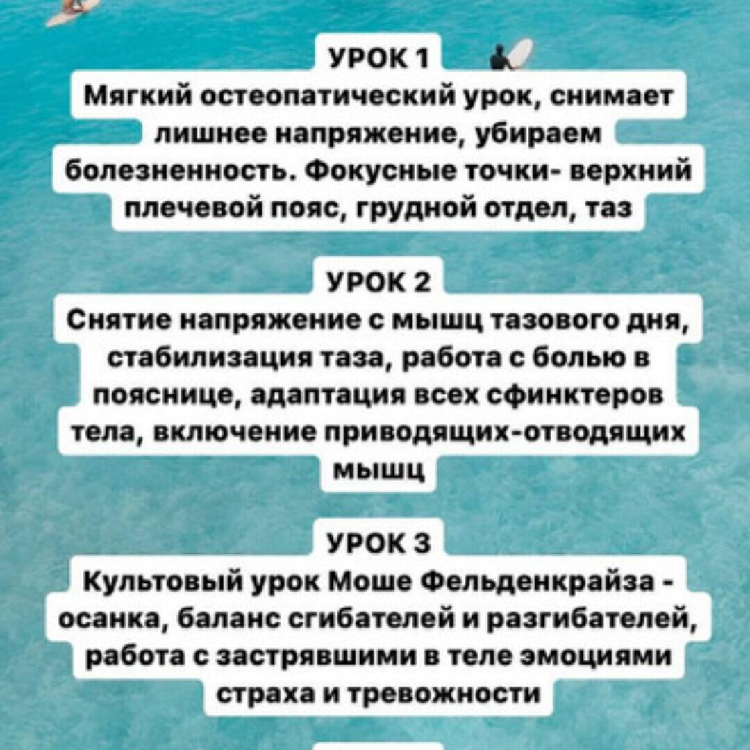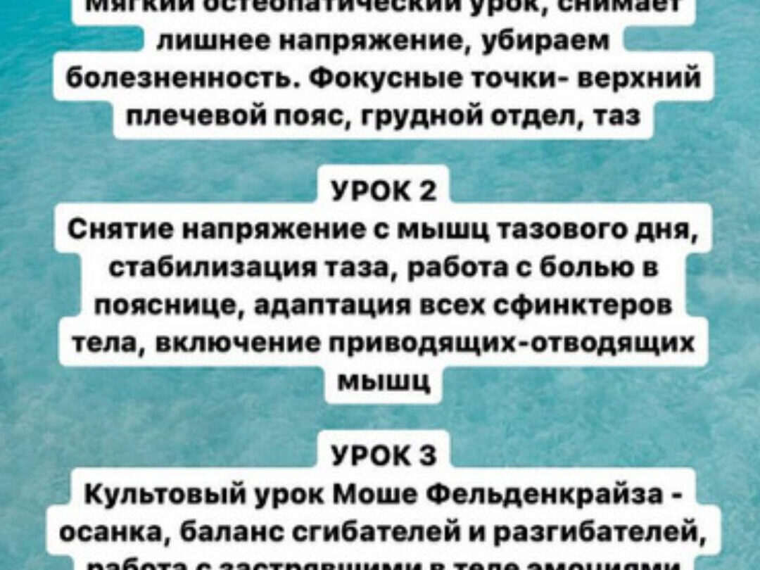 1 урок - остепатический урок. Снимаем напряжение 2 урок - работа с тазовым дном 3 урок - разблокировка шеи 4 урок - ляжкам бой Научный подход к занятиям. Уроки подходят тем кто хочет привести тело в лучшее состояние. Подходит тем у кого есть проблемы. Подходит тем кто занимается спортом и хочет