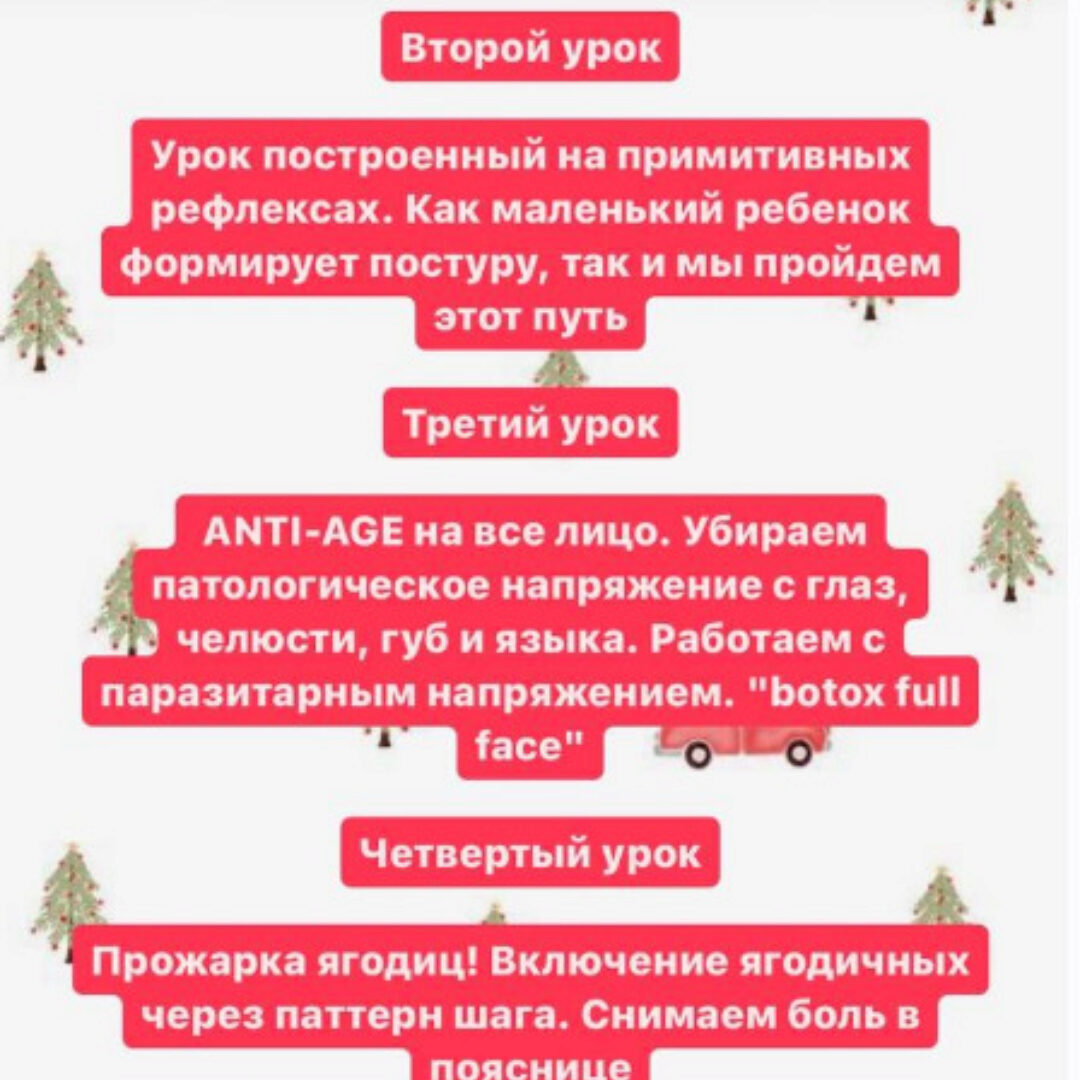 ПРОГРАММА ЯНВАРЯ 02 - 07 ЯНВАРЯ Тренировка «Подтянутый живот». 30 минут Тренировка «Осанка и мобильность». 28 минут Комплекс «Женское здоровье». 25 минут Танцевальная тренировка. 28 минут Упражнение на дыхание. 5 минут Упражнения для плоского живота. 5 минут 08 - 14 ЯНВАРЯ Комплекс «Подтянутый