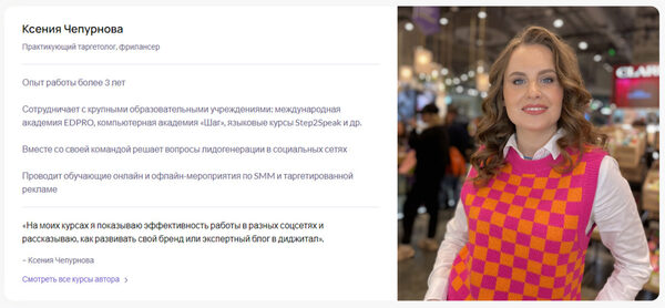 Этот курс для тебя, если ты: – начинающий маркетолог, который хочет стабильно и хорошо зарабатывать – предприниматель, планирующий масштабировать свой бизнес и увеличить прибыль – специалист, имеющий смежную профессию, который ищет новые источники заработка – эксперт, который пытается