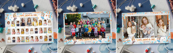 В шаблон входят: весь текст можно менять - он в шрифтах два варианта обложки — общая и с портретом 7 разворотов - включая варианты для альбома общей верстки и разворота с учителями все элементы можно двигать - они на разных слоях шрифты входят в набор расположение фото и количество детей в виньетке