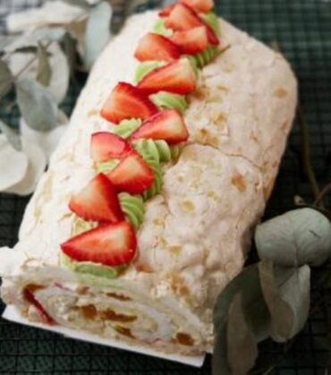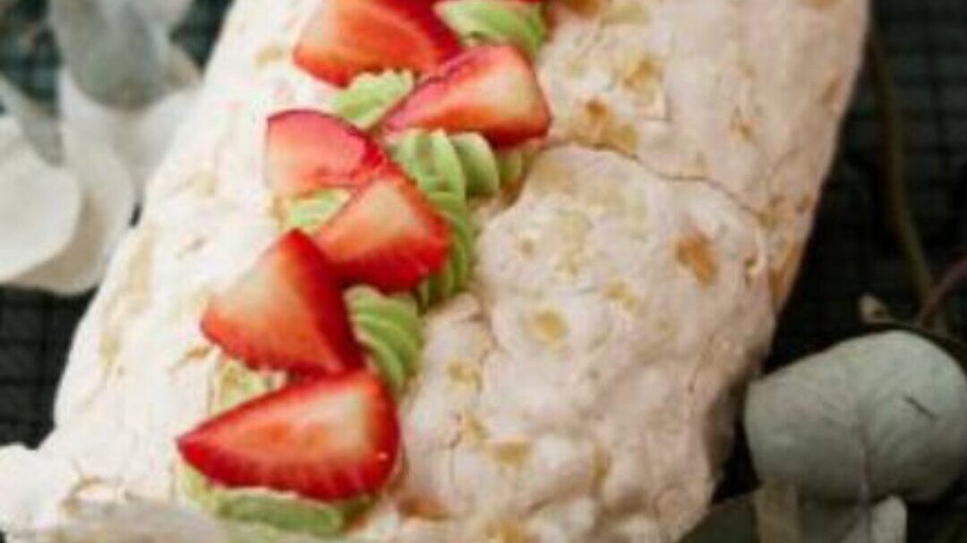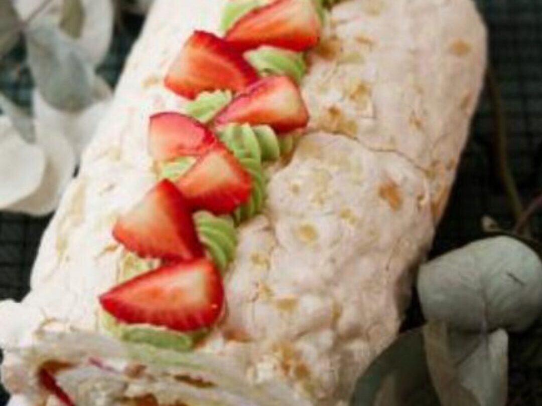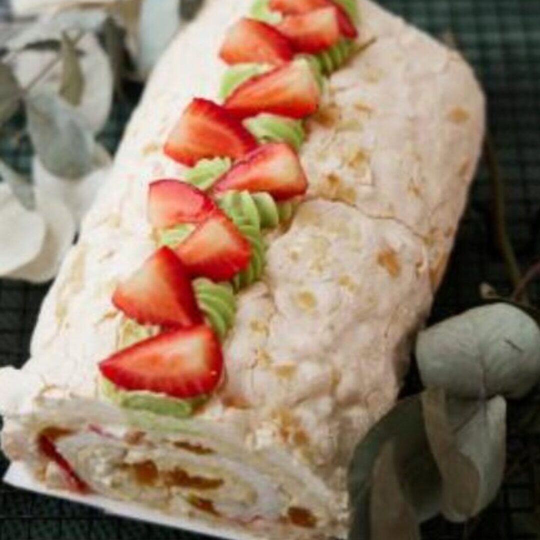 Нежно воздушное как облако безе, свернутое в виде рулета, внутри сливочный крем с ванилью, тропическая начинка из манго и маракуйи и свежая клубника. Я пока еще не встречала человека, кто бы попробовав его не влюбился в этот десерт с первой ложки.