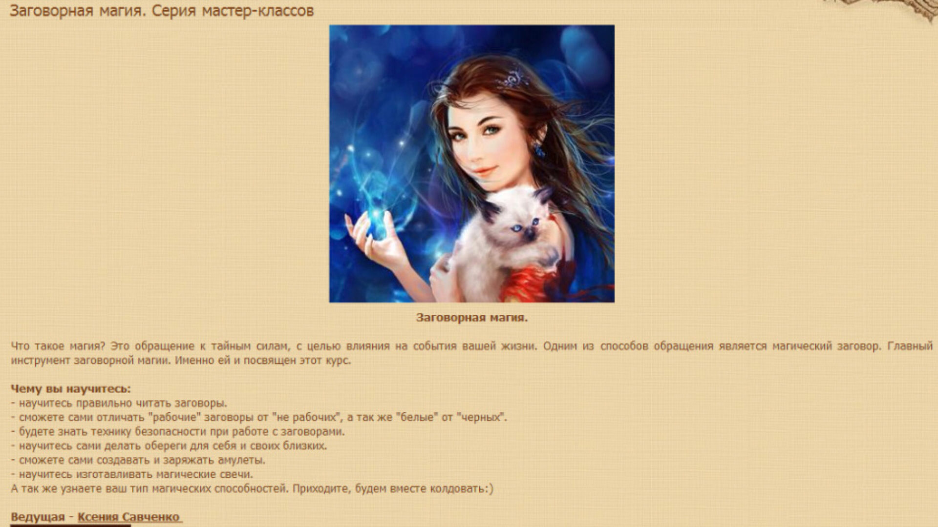 Обучающий курс, посвящённый созданию таких магических артефактов, как талисманы, обереги и подклады. В него входят следующие темы: • Обереги природного происхождения (растения, камни и металлы, обладающие защитными свойствами). • Магические обереги (что они из себя представляют и с какой целью их