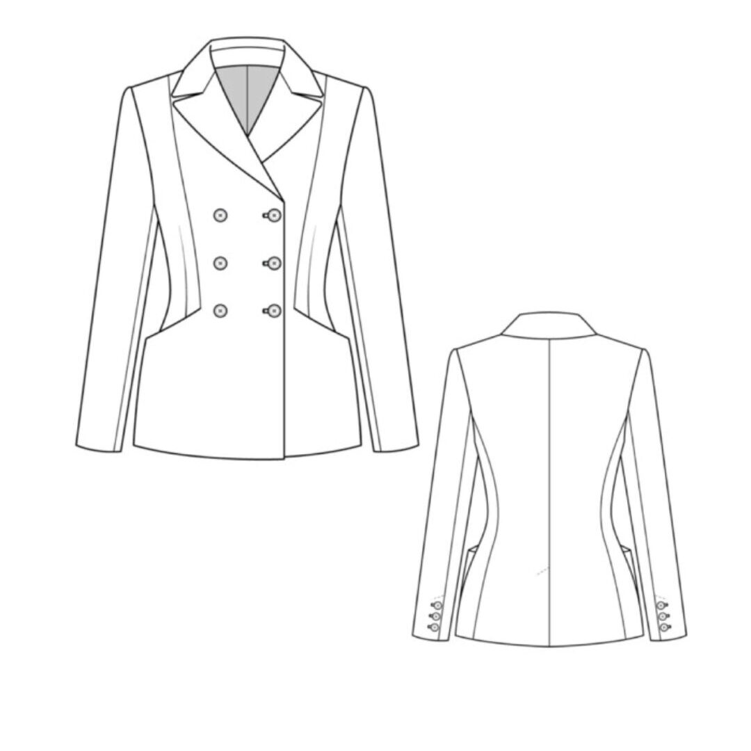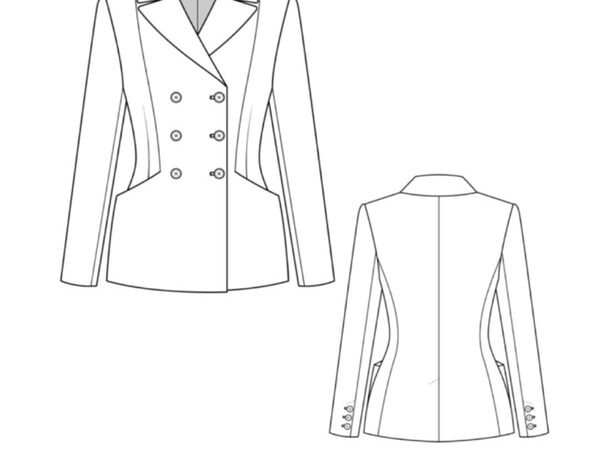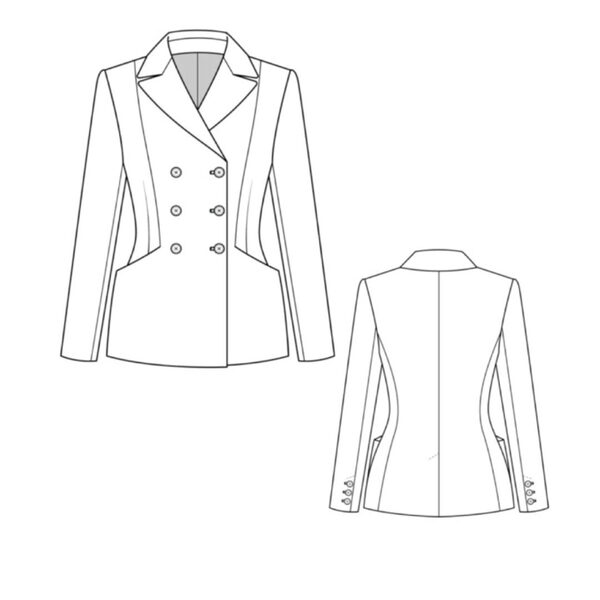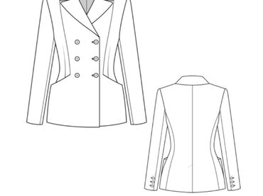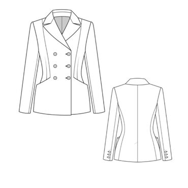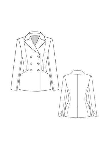 Курс Жакет 0306 размеры 40-54 рост 164, автор La forme. Жакет прилегающего силуэта со смещенной застежкой (двубортной). Длина жакета до линии бедер. Перед с вертикальными рельефами и талиевой вытачкой, с объемным боковым карманом. Спинка со средним швом и шлицей в нем, с рельефом из проймы. Воротник пиджачного типа с лацканом и отрезной стойкой. Рукав втачной двухшовный с открытой шлицей и пуговицами.