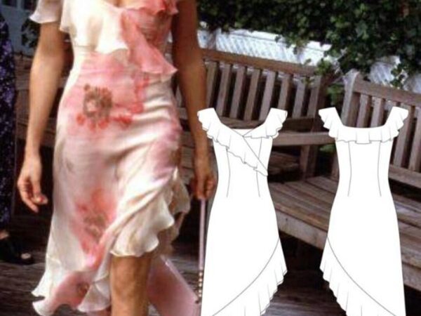 Комфортное платье с воланами. Модель имеет втачной рукав на сборке с завышенной линией плеча. Рубашечный воротник, который можно шить и с воротом-стойкой! Планка на пуговках до талии. Рукав на резинке. Техническая документация к лекалу включает в себя: описание пошива, прибавки, припуски и основные