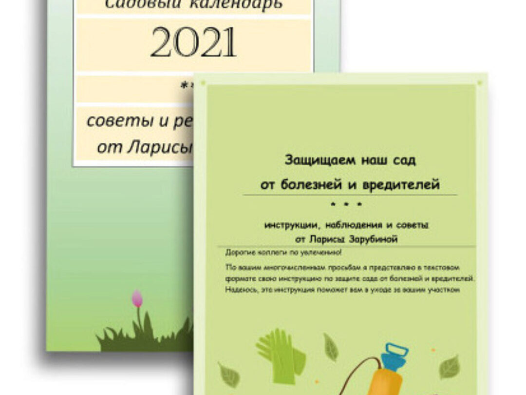 Дорогие друзья, вы можете приобрести комплект, в который входят Календарь основных работ в саду и Инструкция по обработке сада от болезней и вредителей по очень выгодной цене! Информация в календаре и инструкции прекрасно дополняют друг друга! Оба издания предоставляются в электронном виде, вы можете пользоваться для чтения любым электронным устройством или распечатать на бумаге.