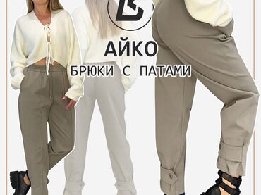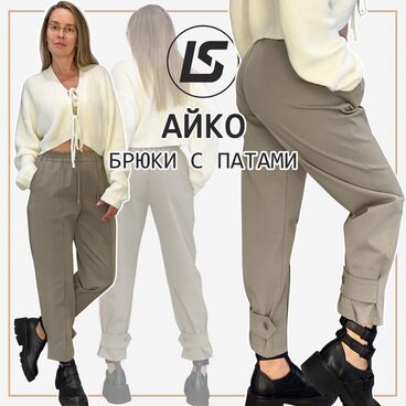 На модели брюки размер в размер 44/46, параметры модели 68 талия, 98 бедра. Светло-серые хлопковой джинс, брюки цвета капучино футер 2хнитка пике.
