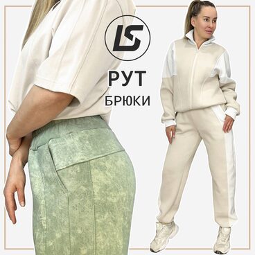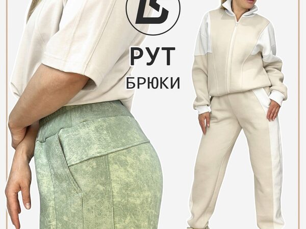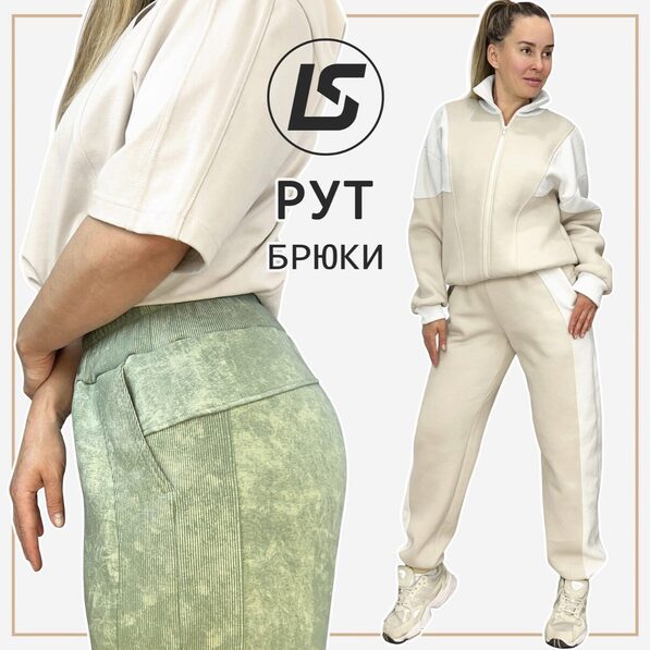 Бежевая модель на обложке товара пошита из футера начес, а вставки из футера барашек изнанкой на лицо. Вторая модель это футер 3х нитка начес с эффектом варенки и вставками из кашкорсе.