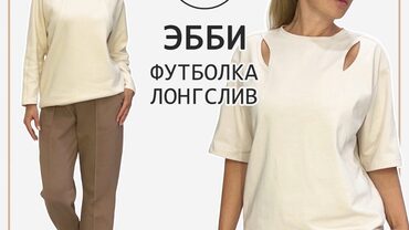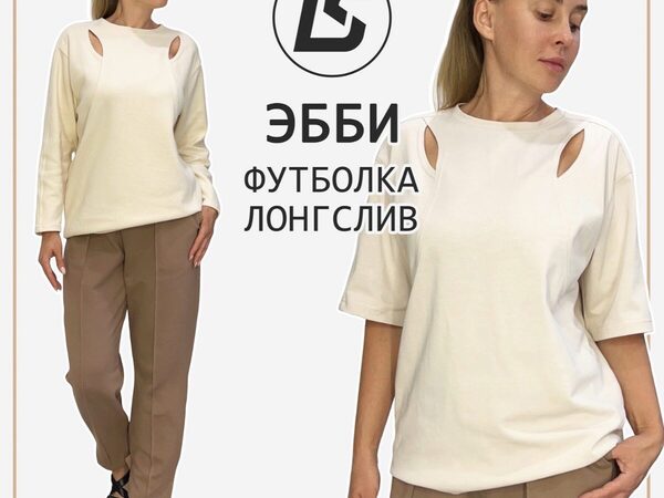 Выкройка представлена в размерах 40-60 на рост 170 см. Футболка (лонгслив) свободного кроя, прямого силуэта, плечо немного спущено. Два варианта длины рукава – короткий и длинный с манжетой по низу рукава. Два варианта обработки горловины – окантовка бейкой на распошивальной машине, либо обтачкой
