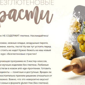 Это потрясающая обучающая программа из 3 мастер-классов, посвященная выпечке и мучным изделиям без глютена. Любимые плюшки, пельмени и расстегаи в новом anti-age-прочтении. Готовить легко и просто! Все ингредиенты — понятные и доступные. Вреден ли для вас глютен или вы самостоятельно приняли решение отказаться от него — совершенно неважно. Важно, что это невероятно вкусно! Готовьте сами для всей семьи в формате gluten free (без глютена).