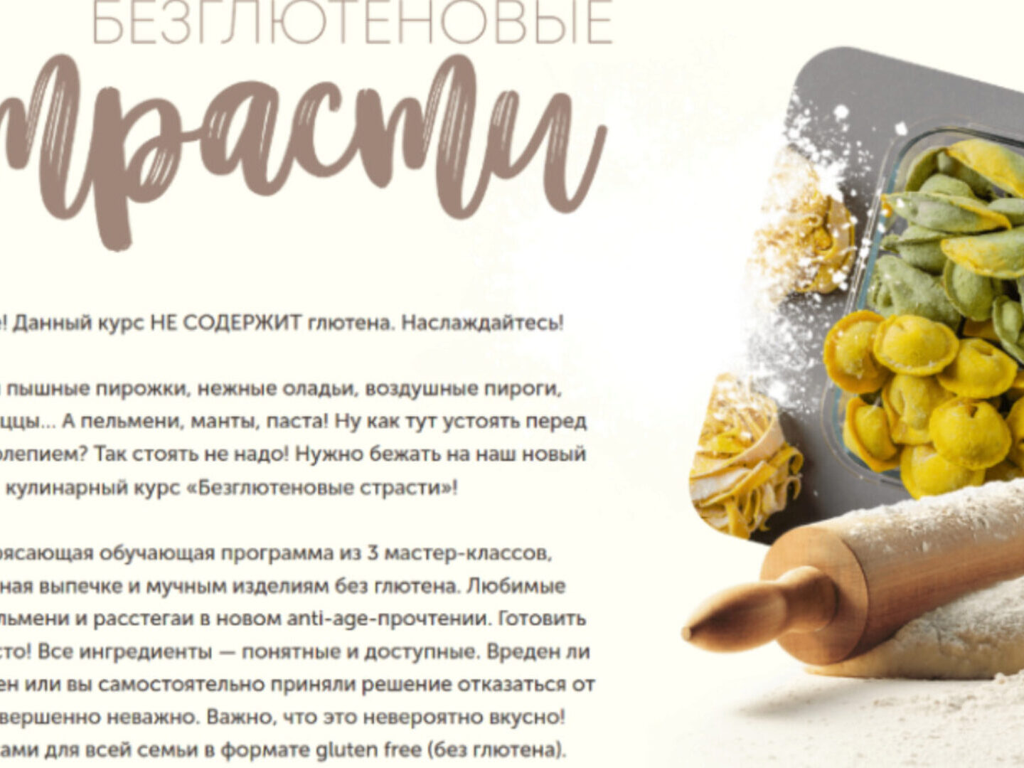 Ох уж эти пышные пирожки, нежные оладьи, воздушные пироги, манящие пиццы… А пельмени, манты, паста! Ну как тут устоять перед всем великолепием? Так стоять не надо! Нужно бежать на наш новый кулинарный курс «Безглютеновые страсти»!