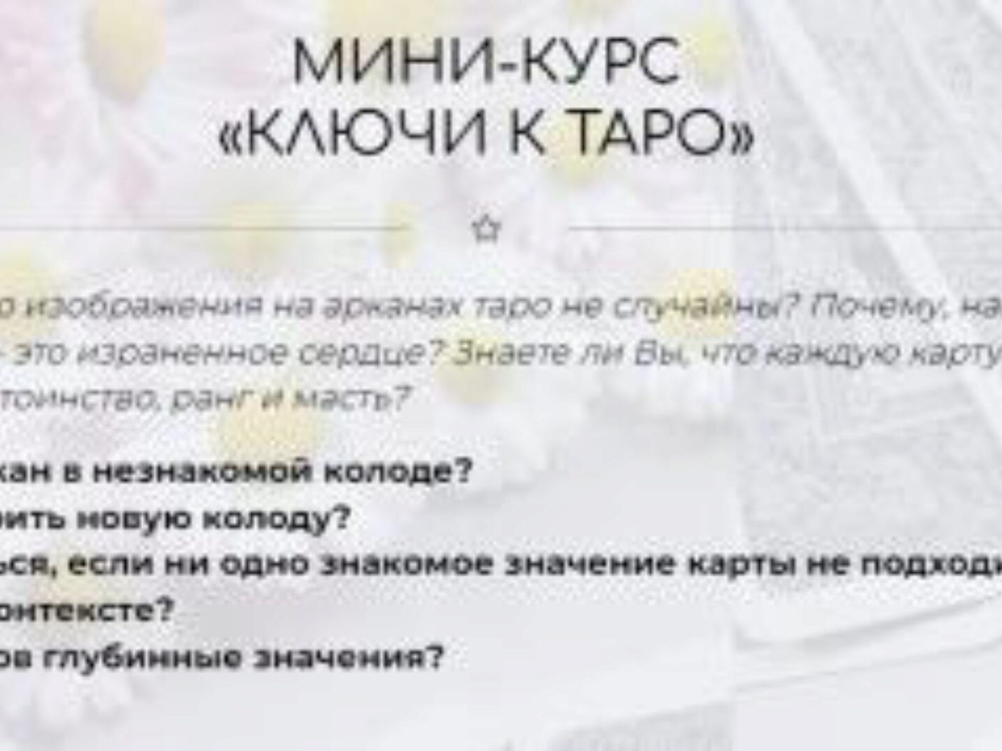 Благодаря этому курсу Вы глубже узнаете систему таро, сможете работать с множеством других колод и легко будете разгадывать замысел авторов: как они видят тот или иной аркан, а также чем он будет отличаться от классического таро Уэйта.