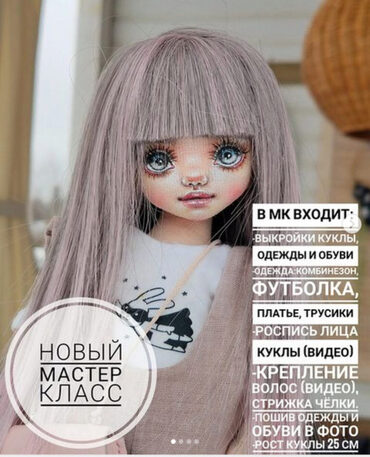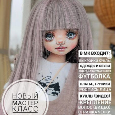 ЧТО ВХОДИТ В МАСТЕР-КЛАСС В этом МК два варианта ручек: - 1 вариант - ручка с цельной ладонью. - 2 вариант - ручка с пальчиками. В МК входит пошив и выкройки одежды: платье, панталоны, ботинки, чулки. Выкройка и пошив тела куклы. РОСПИСЬ ЛИЦА в формате видео. Очень подробное видео. Крепление волос