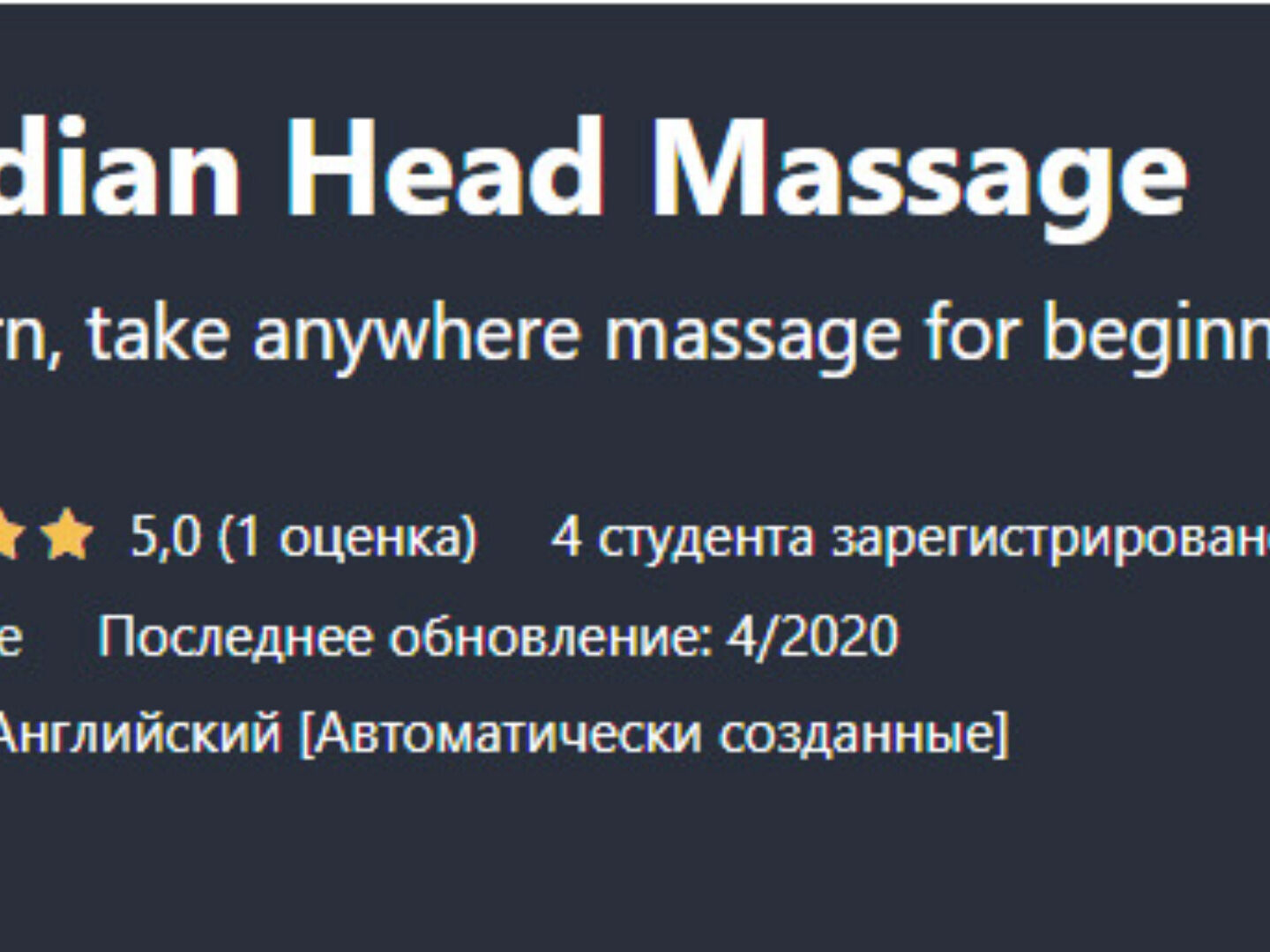 Блаженный смешанный массаж: тайский, шведский, индийский массаж головы и другие Знакомство с международными стилями массажа: мощные, но простые методы расслабления, бодрости и облегчения Рейтинг: 4,5 из 54,5 (4 оценок) 13 студентов Авторы: Команда Эбодхи Последнее обновление: 7/2020 Английский