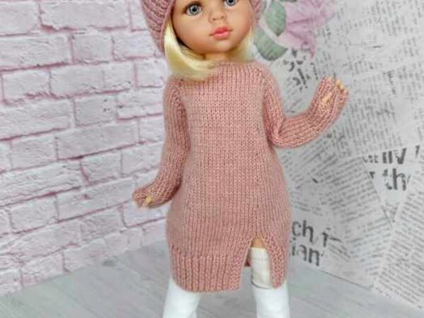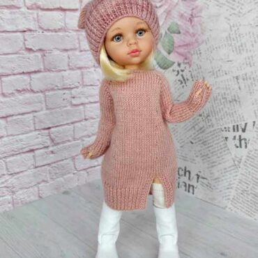 По этому описанию вы сможете связать платьице и шапочку для куклы Паола Рейна или ей подобной. Платье полностью распашное, с застежкой на пуговицы на спинке, вяжется на двух спицах поворотными рядами, рукав сшивается крючком. Шапочка вяжется на 2/5 спицах. Платье вяжется на спицах №1.7-2 + крючок